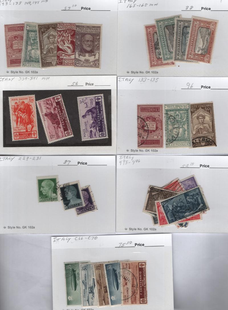 Selection (5) cplt sets (1) partial set, owner IDed & CV (NV), nice variety incl unused #58-63 CV $145.70 LH, 159-64 $195 NH brownish gum, B20-25 $82 NH, C34 $110 NH, C80-83 NH $192 missing only C79 to be cplt, C95-99 $335 NH, CE8-9 $90 NH, nice