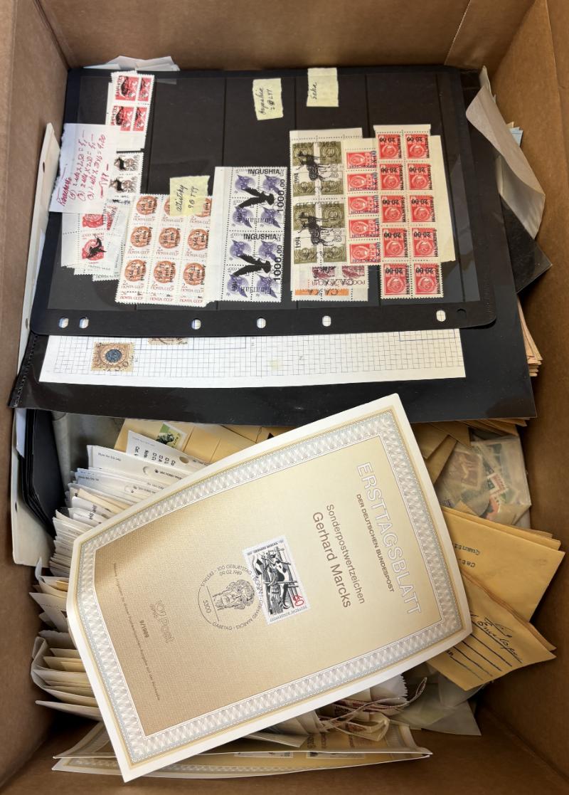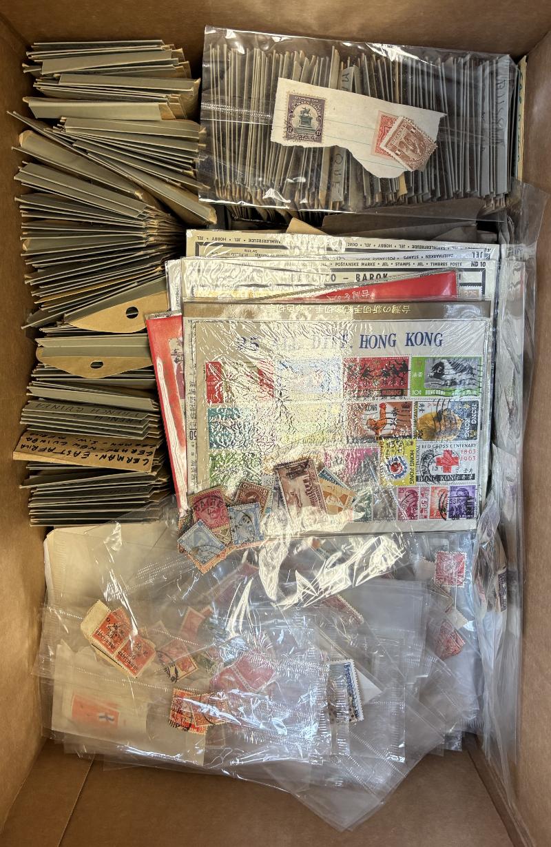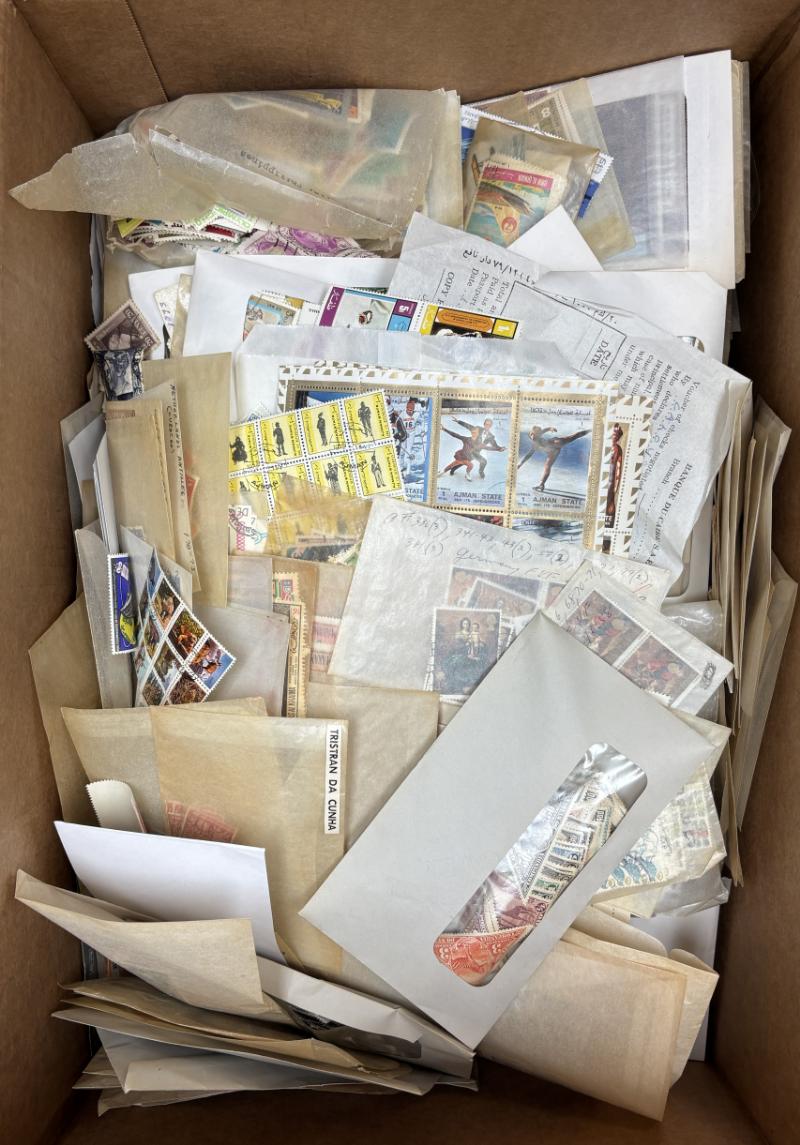 1530 Many (1000s) in disorganized mish-mash medium carton; much in glassines, often by country or set, also loose album pgs, dealer cards, a red stkbk w/ mostly unused French & Area, a few sleeved covers & FDC, manila stkpgs & more; sets, country groups, S/S, all sorts; noted France, Ryukyus, much Brit Commonwealth, topicals, mostly 20th Cent, gen F-VF