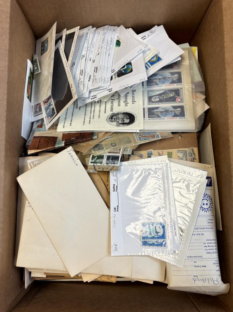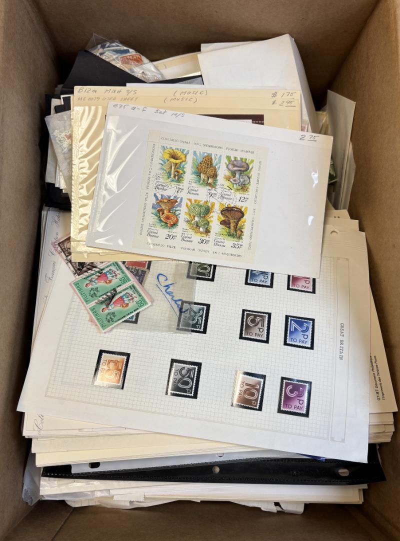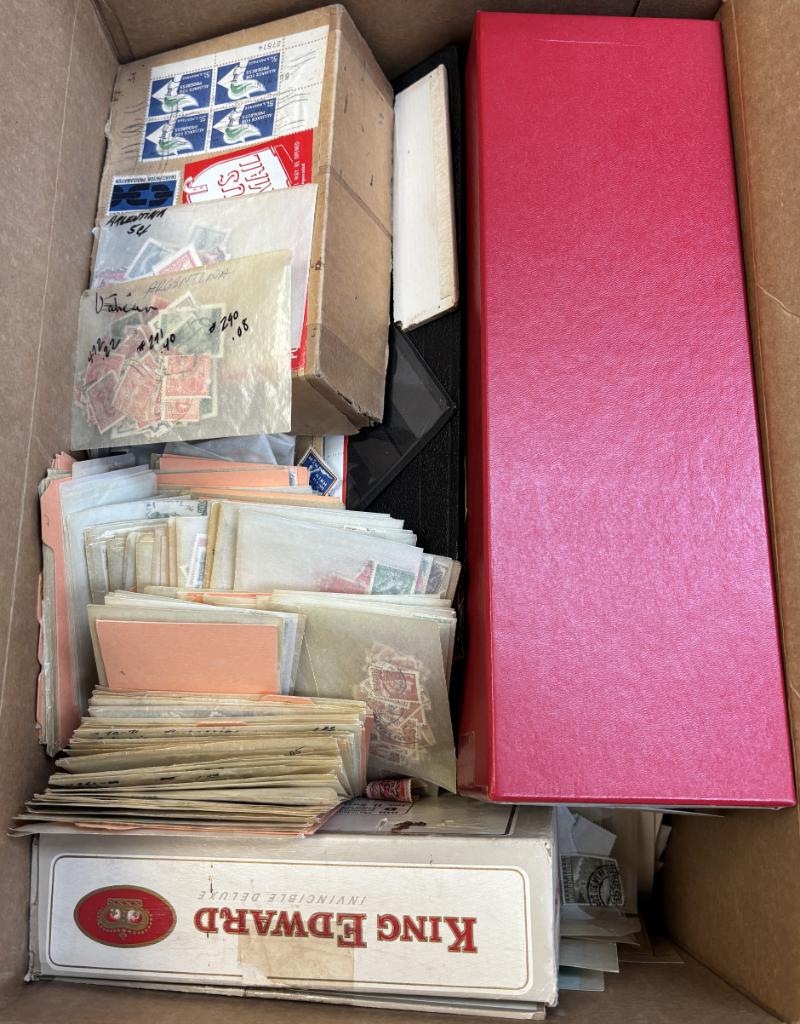 1542 image Dealer Accum of glassines, pgs, both album & stk, cigar boxes, envs, many diff countries plus (3) red boxes incl: Belgian Congo to Burma; Colombia to Fiume; Canada to France, nice variety on 102 cards, there are (1000s) */O, better to be found, great for collector or dealer, most F-VF (Image)