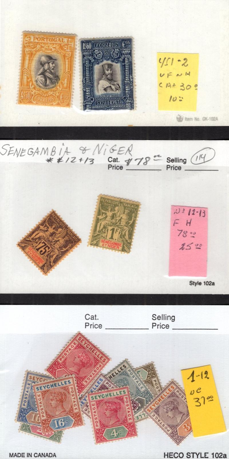 Seychelles 1-12, SWA 121-24, B5-8, B9-11, Sweden 33, Switz 97, Virgin Is 14 & Used: Australia 11, Canada 14-15, Belgium 48, Cape of Good Hope 4, 39, Denmark 35, France 20, Greece 6, GB 80, 139, India 25, 97, Mauritius 19, 27, 42, NZ 54, Portugal 10,