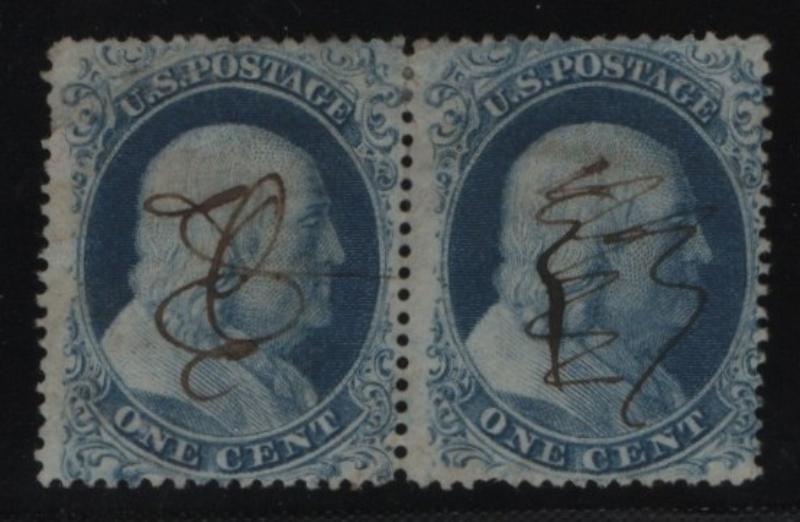 F-VF Pair, 1¢ blue Franklin, Types I & II, couple SP, ms cancels (Image)