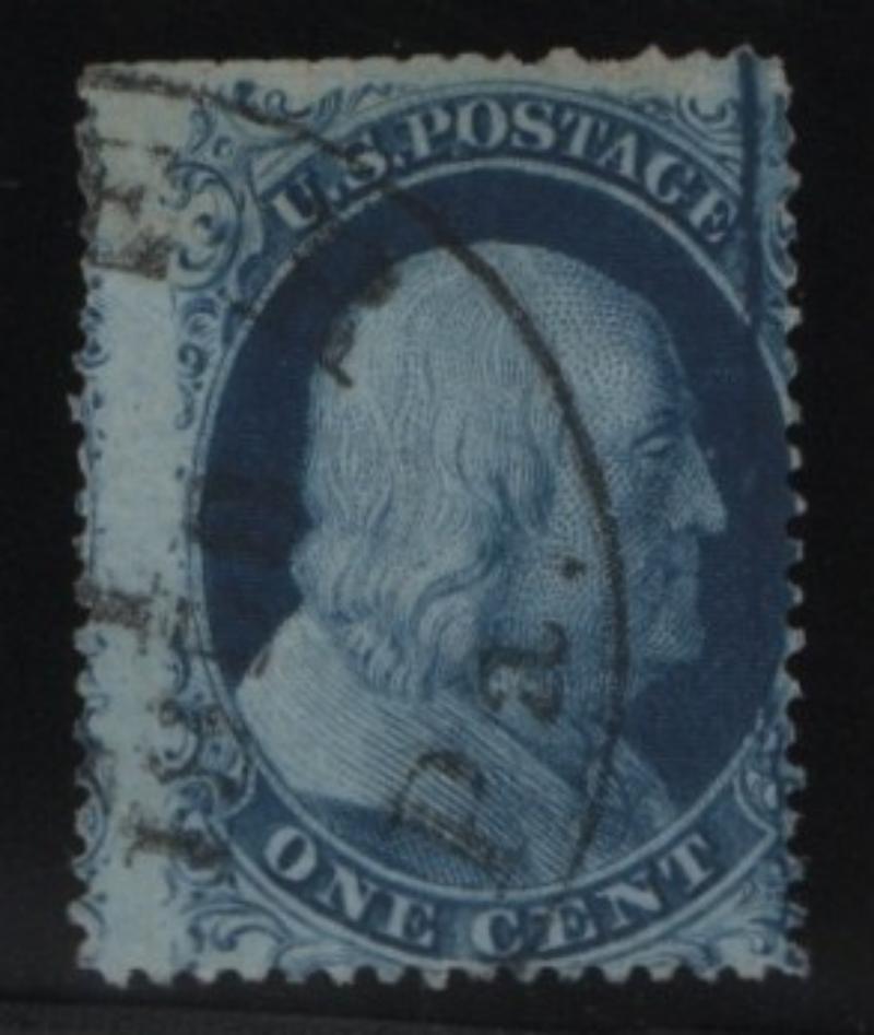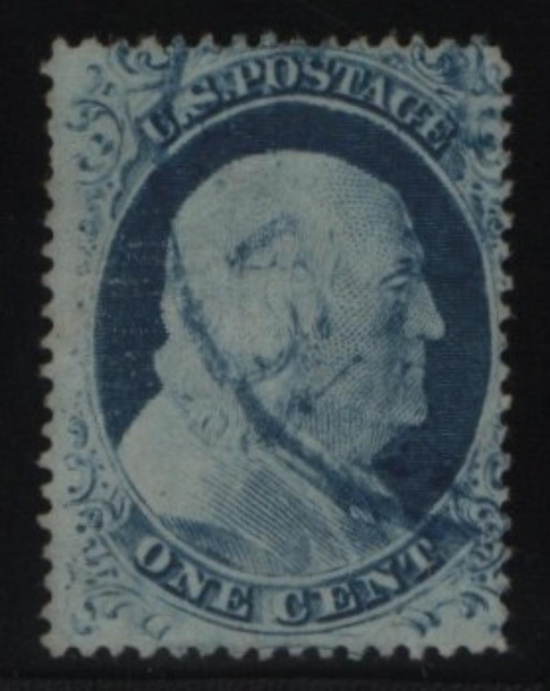 F-VF 1¢ blue Franklin, Type IV, recut once at top, twice at bottom, blue town cancel, 2012 Weiss Cert (Image)