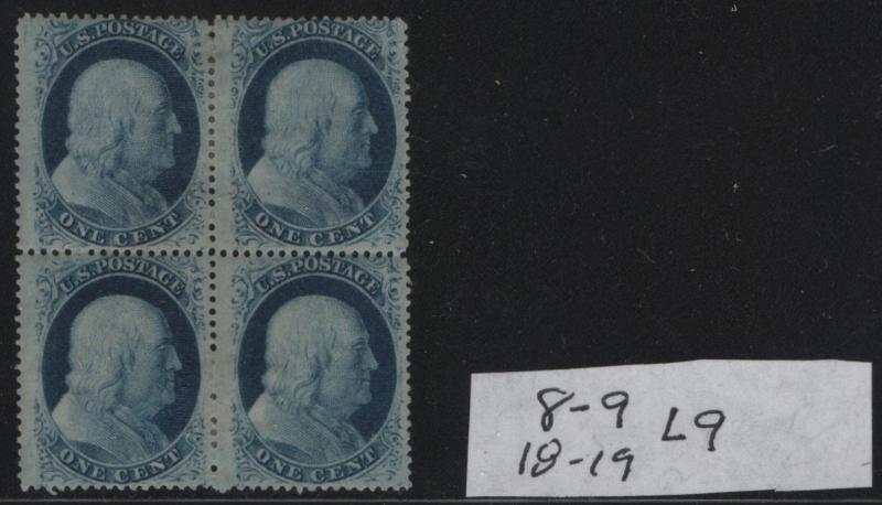H, Block, 1¢ blue Franklin, Type V, pos. 8-9-18-19L9 (Image)