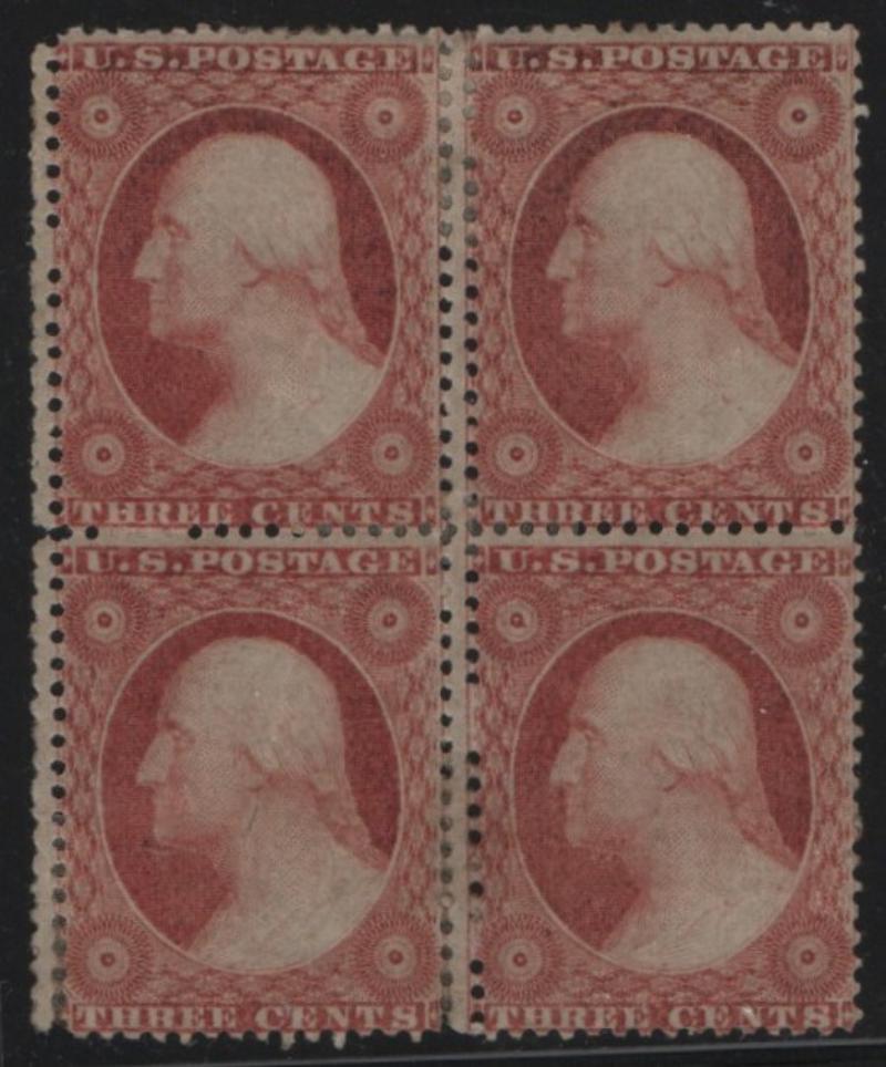 F-VF HH, Block, 3¢ dull red, Type III, w/ double rows of vertical perfs (Image)