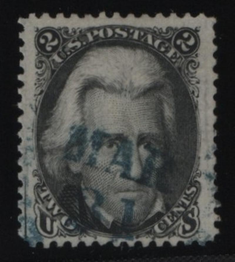 VF-XF 2¢ black Jackson w/ blue dated cancel, huge margins on (3) sides (SMQ for VF-XF $160) (Image)