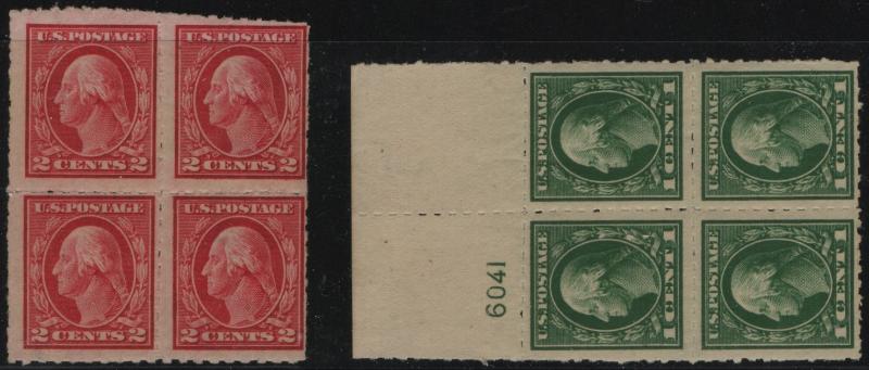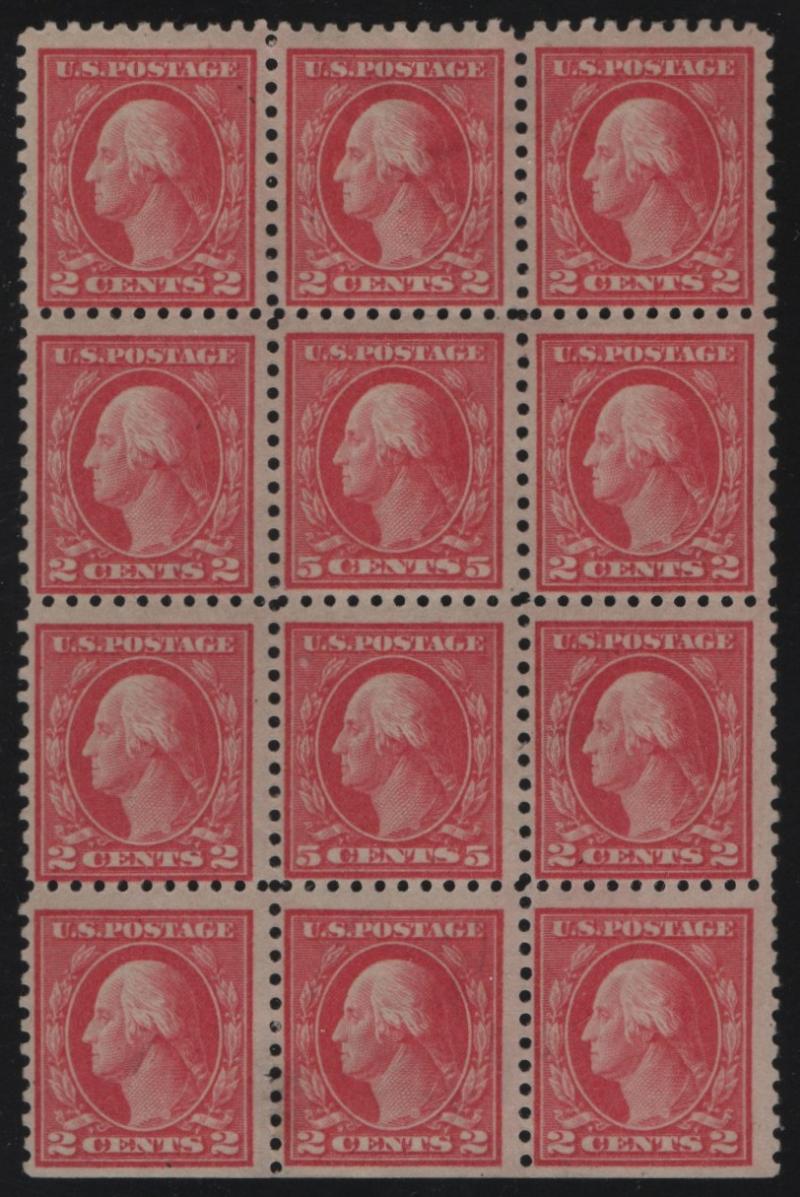 F-VF Two 5¢ carmine ERRORs in block/12, both errors NH but one w/ PMG, one of #463 has hinge thin, two other #463 w/ DG (Image)
