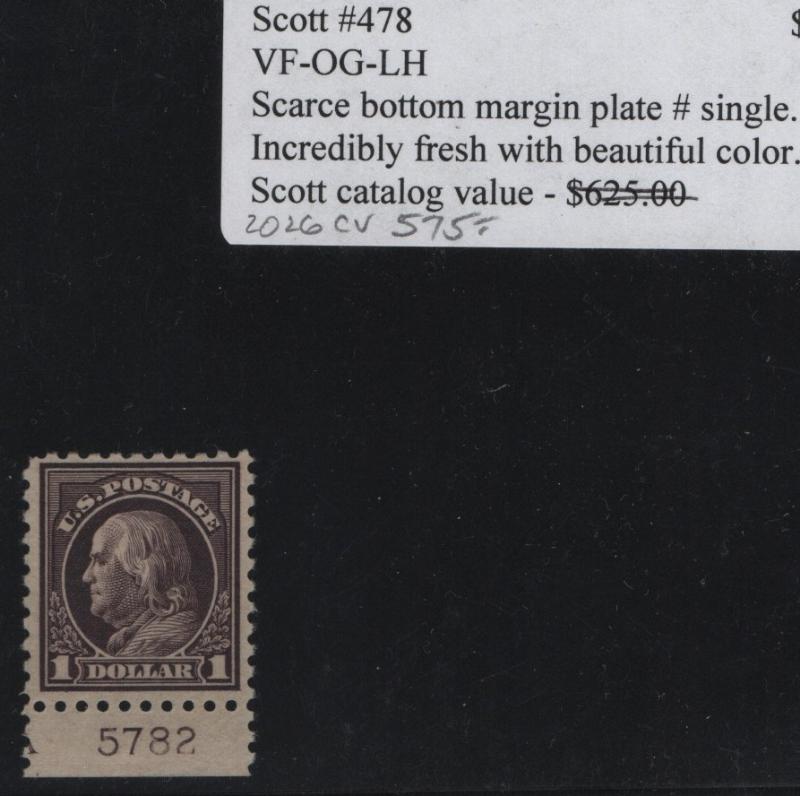 LH, $1 violet black Franklin, perf 10, bottom pl# single, pl# 5782 (Image)