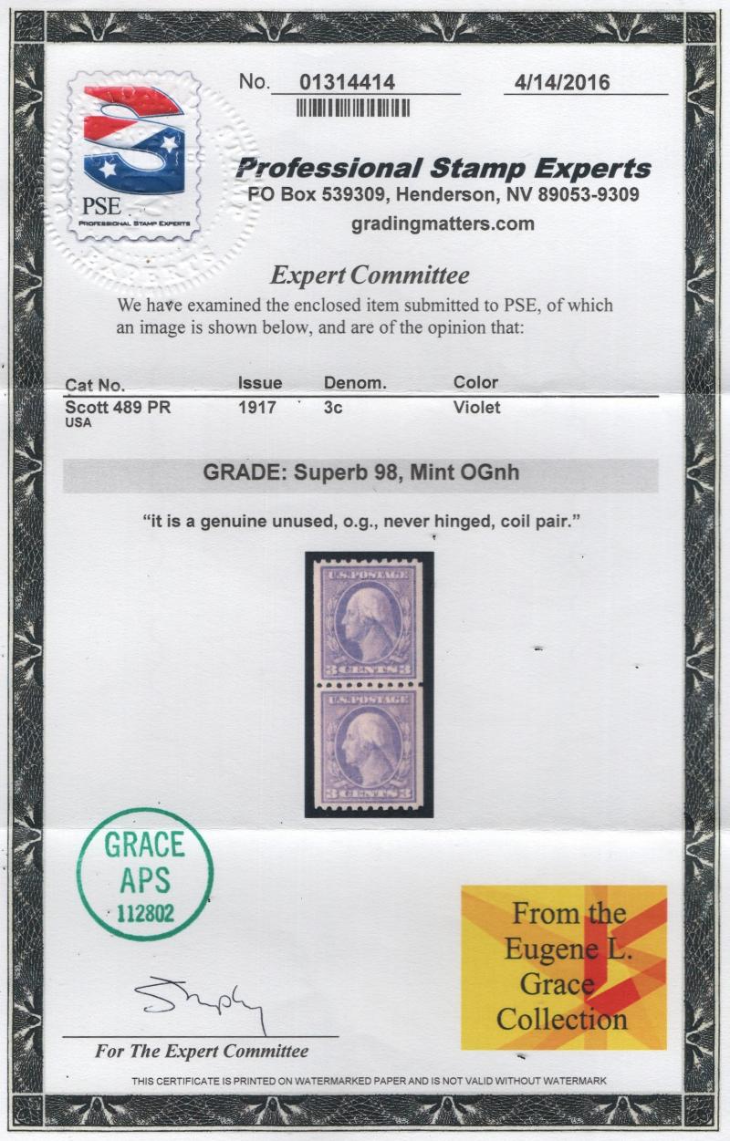 SUP NH, Washington 3¢ violet V coil pair, 2016 PSE Graded Superb 98 (CV is Scott by grade) ex-Grace (Image)