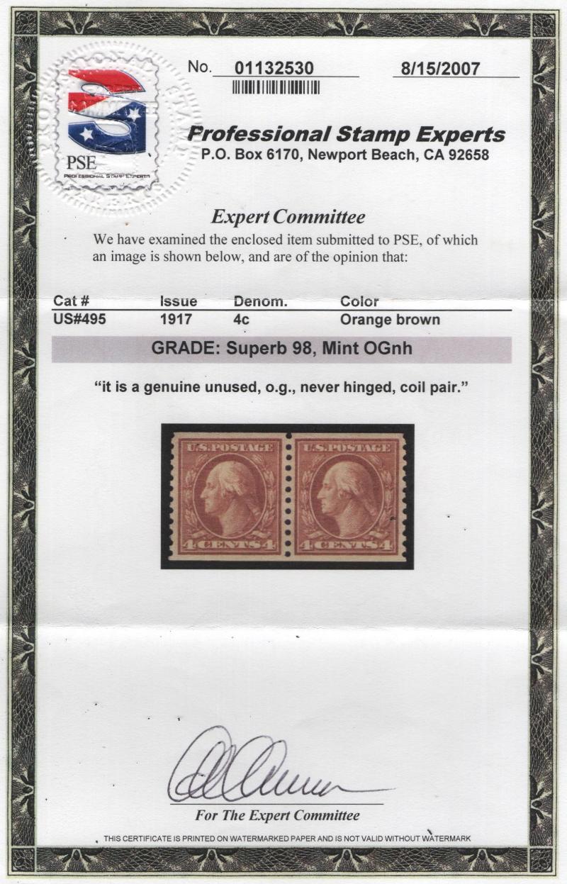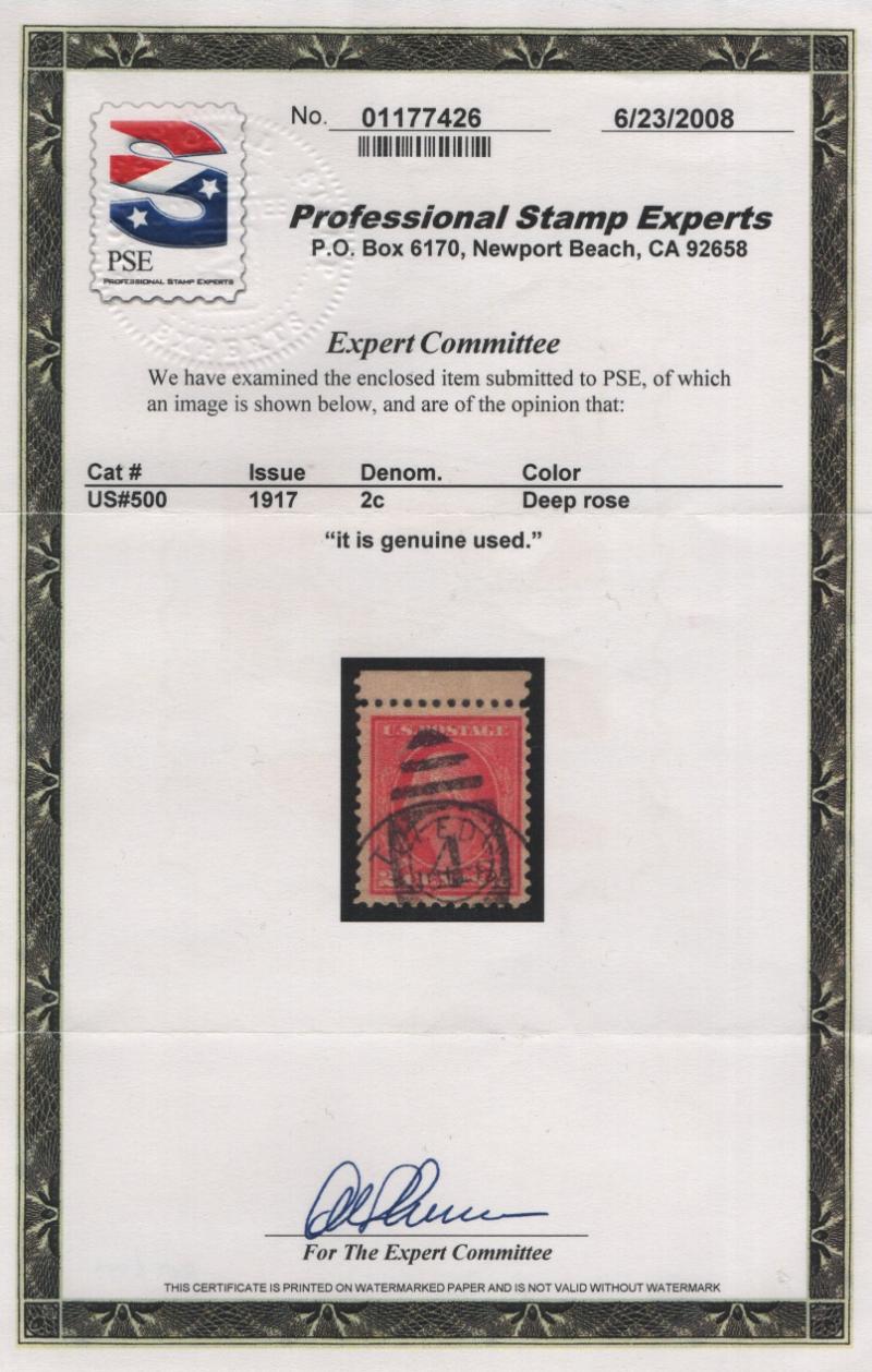 517 Two well-centered used Wash/Frank w/ Certs: #500 top margin single, VF-J w/ large margins, Toledo duplex, 1981 PF & 2008 PSE Certs (CV $240); #517 part double oval cancel, 2005 PSE graded XF-Sup 95 (SMQ $110). (Image) (imageb)