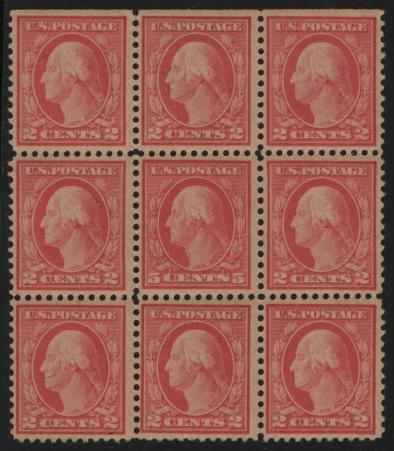 F-VF H, Block of 9 w/ 5¢ rose ERROR in middle (error NH) (Image)