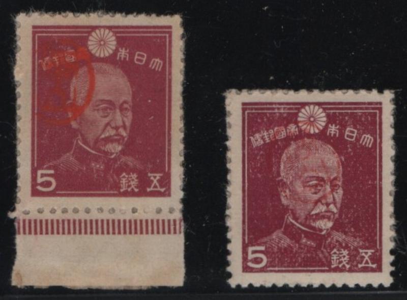 Miyako Provisional 5s examples of both shades, red lilac & dark red lilac (colors per RPSS PM6, PM6a); lighter shade w/ strong vermilion chop & bottom selvage (pos 93), darker w/ faint red chop; both w/ backing paper & decent centering, VF (Image)