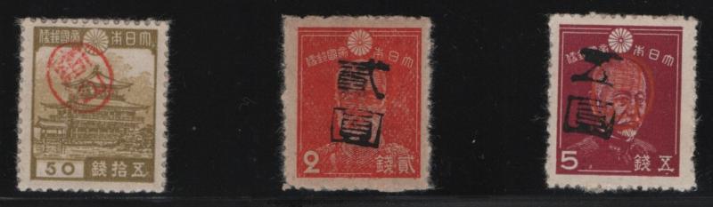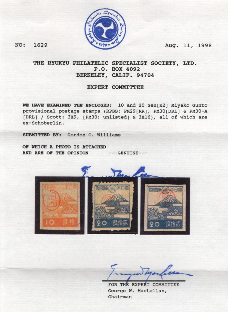 Selection (3) Miyako Provisionals, ea w/ RPSS photo-Cert; 3X21 50s, 3X28 ¥2 on 2s scarlet and 3X30 ¥5 on 5s (backstamped Bush); each w/ full backing paper (Image)