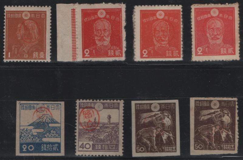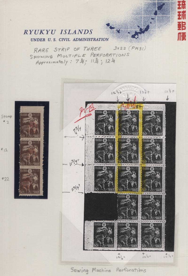 Miyako Provisional 50s dark brown, red seal, vertical strip/3 w/ varied sewing machine perfs, RARE, normal stamps CV $450, documentation from J Bush; unused, NGAI, F, unusual!