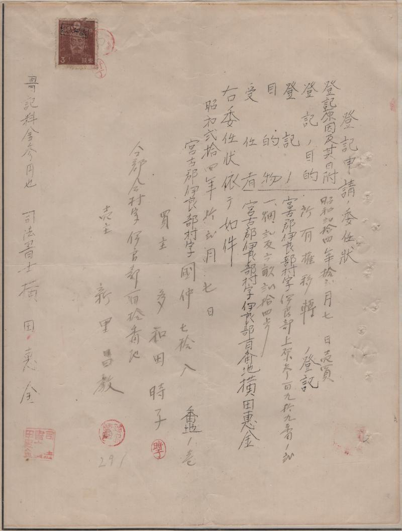 c.1948 Court document w/ 3s brown Miyako Provisional Revenue stamp affixed, tied by (2) diff red chops, three more red chops below, F-VF; listed but not valued by Scott