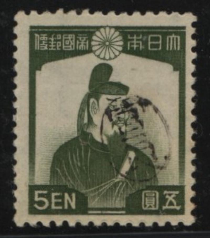Yaeyama Provisional ¥5 deep gray green, part OG w/ evidence that backing paper was removed, no damage, F-VF; 1982 RPSS Cert for original Blk (Image)