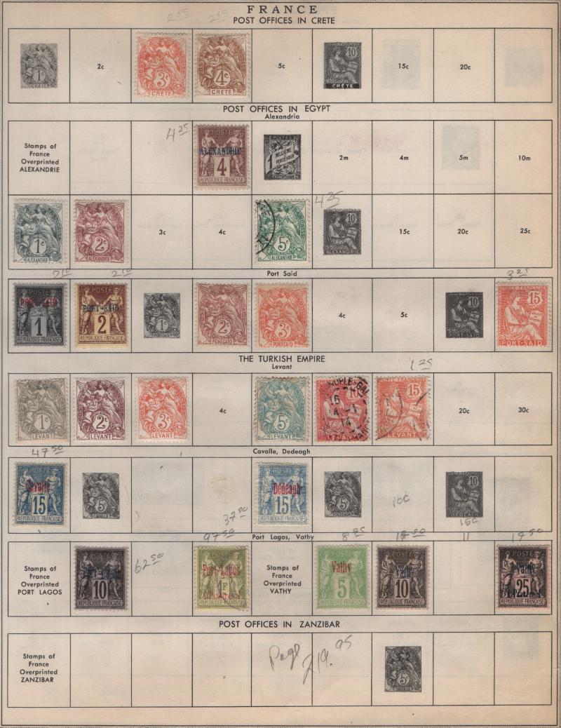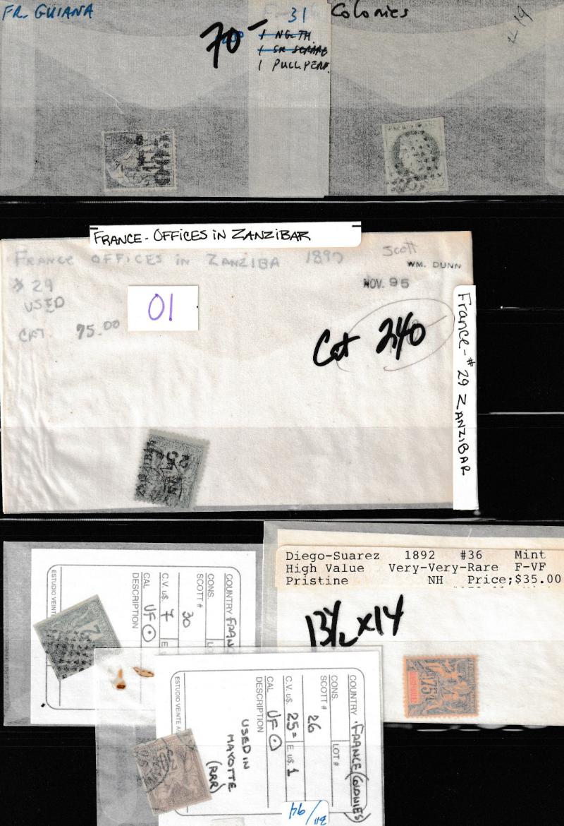 (1000+) */O on album pgs, many 102 cards, dealer pgs w/ many Colonies incl Algeria, Offices in China, French Colonies w/ #26 & 30 used, Crete, Diego-Suarez #36 NH, Guiana 25, 31 pulled perf, Levant, Sudan, West Africa, Zanzibar 29, J1 used & many