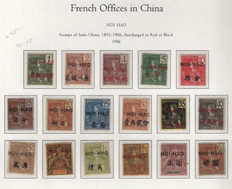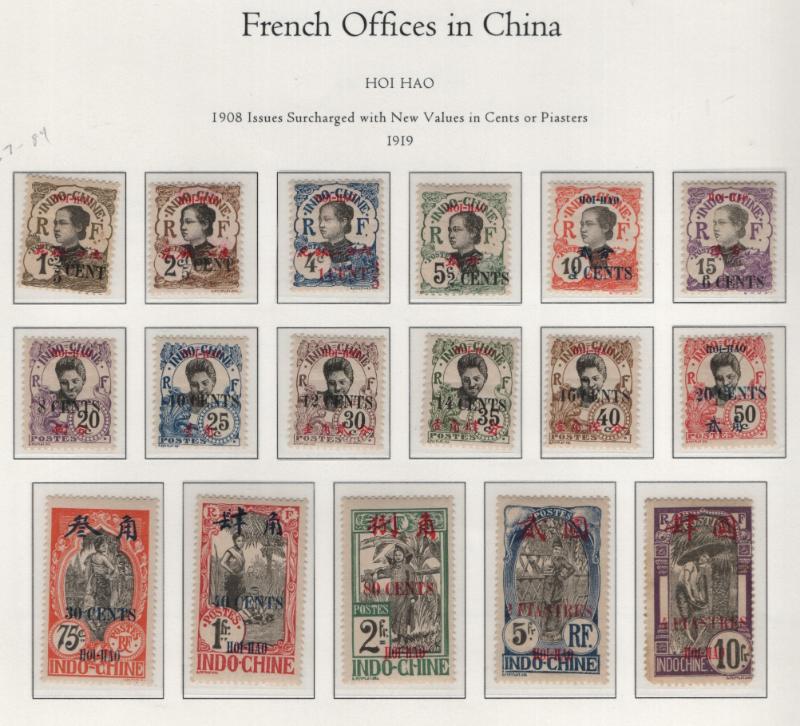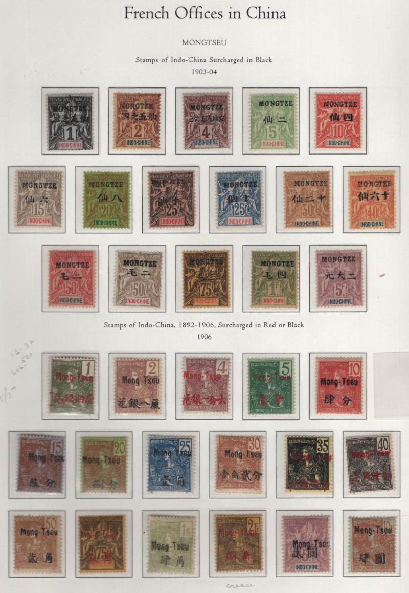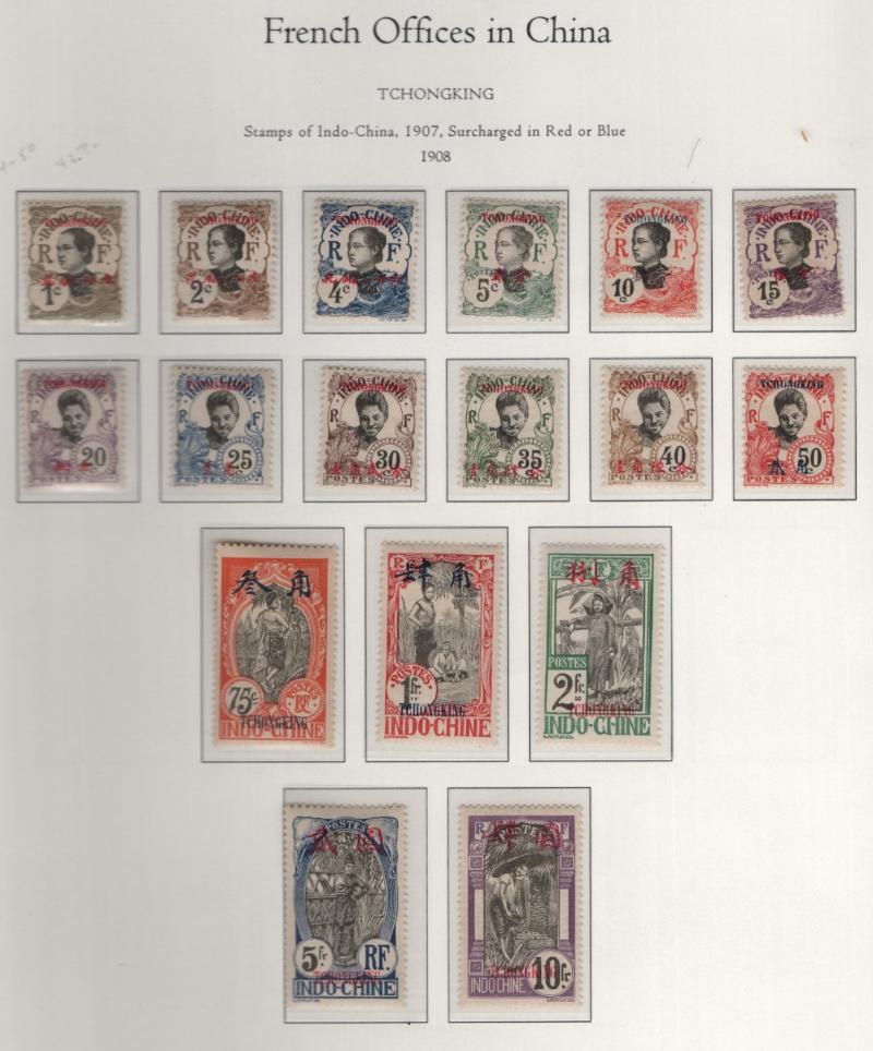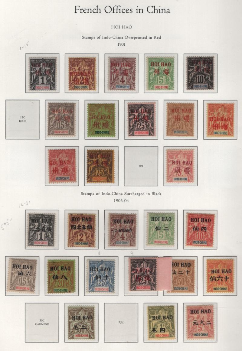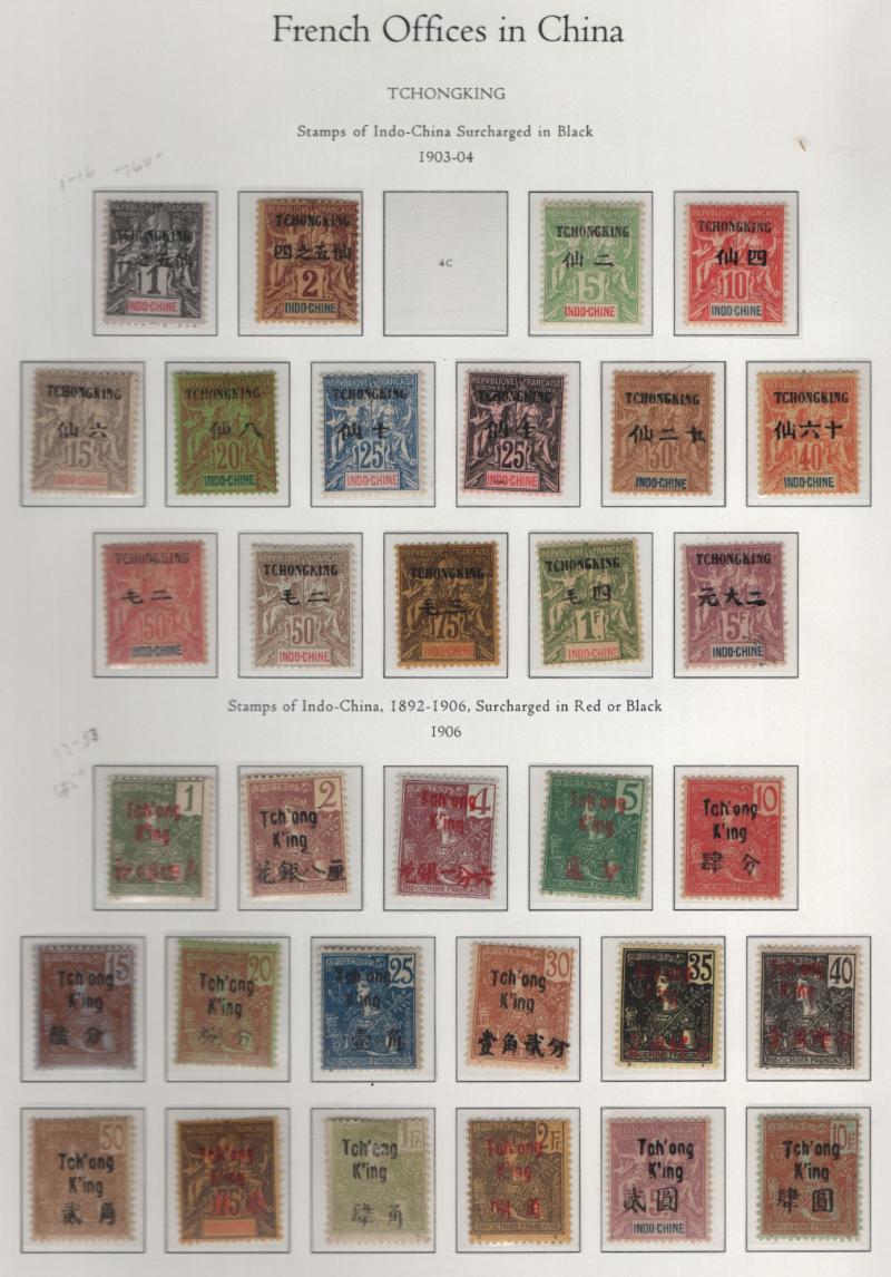 16-30; Pakhoi unused 1-16 (extra 16), 17-33, 52-69; Tchongking 1//16 (no 3, extra 12-14, 16), 17-33, 34-50; Yunnan Fou 10, 12-14, 17-33, 51-67; huge CV but many underlying Navigation & Commerce Indochina stamps are fake & some of the Ovpts could be