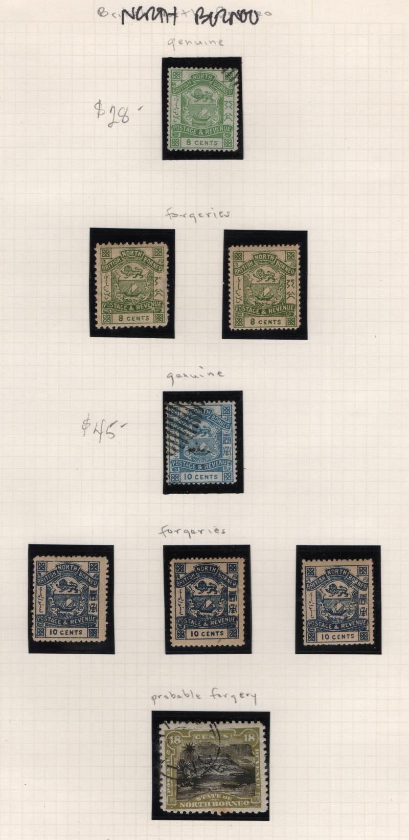 1407 image FORGERIES Accum abt (650) */O WW Forgeries on (26) Hagner or quad pgs in a binder; countries incl Belgium, Bosnia & Herzegovina, China, India States, Iran, Korea, N Borneo, OldenbUrg, Portugal, El Salvador, Spain, Turkey, Ukraine & more; incl sgls & mini-sheets; few flts to gen F-VF H/NH (Image) (imageb) (imagec) (imaged) (All Images)