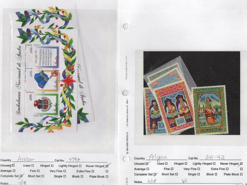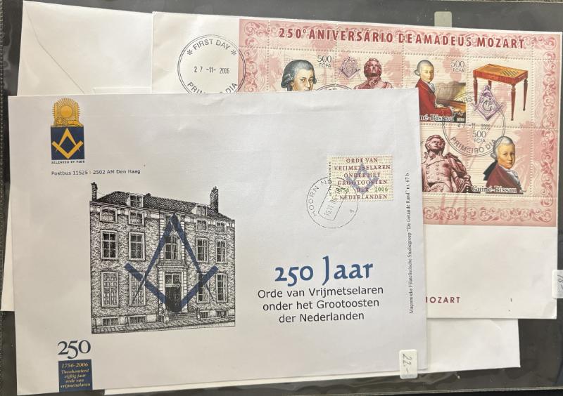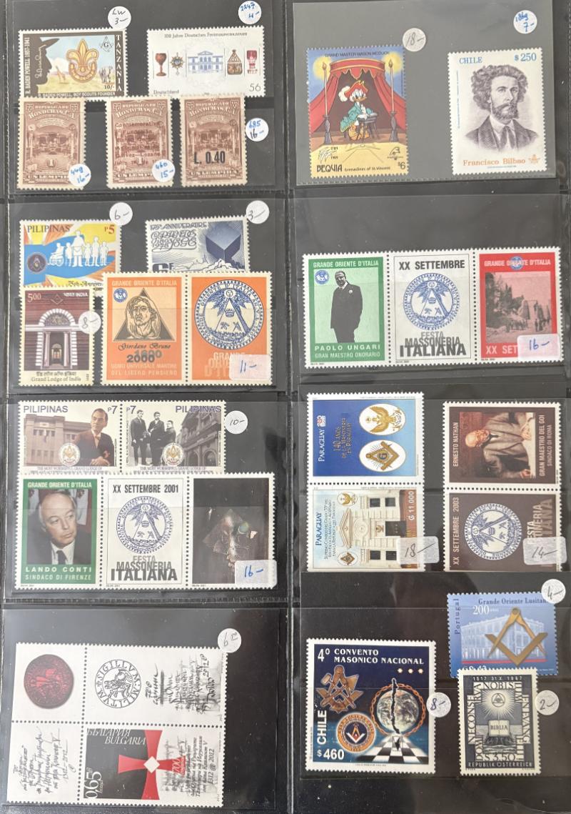 1417 image MASONS Accum abt (300) mainly unused 20th Cent on dealer cards in a binder, incl Unused: Antigua #1732-35, Aruba B43-44, Barbuda 1436-39, Jamaica 768-71, New Caledonia C265, Romania 5547-48, El Salvador 1719, Wallis & Futuna 463 & much more; also Costa Rica 1965 100th Anniv of Masons poster stamp, abt (25+) covers & souv pgs; owner's CV $750 (NV); gen F-VF H/NH (Image) (imageb) (imagec) (All Images)