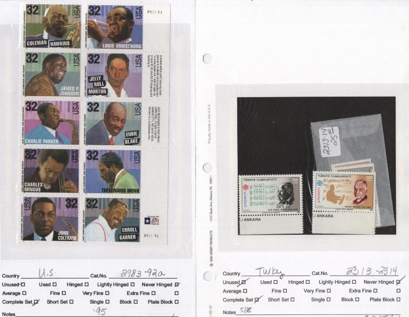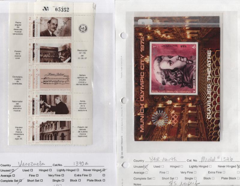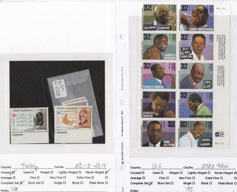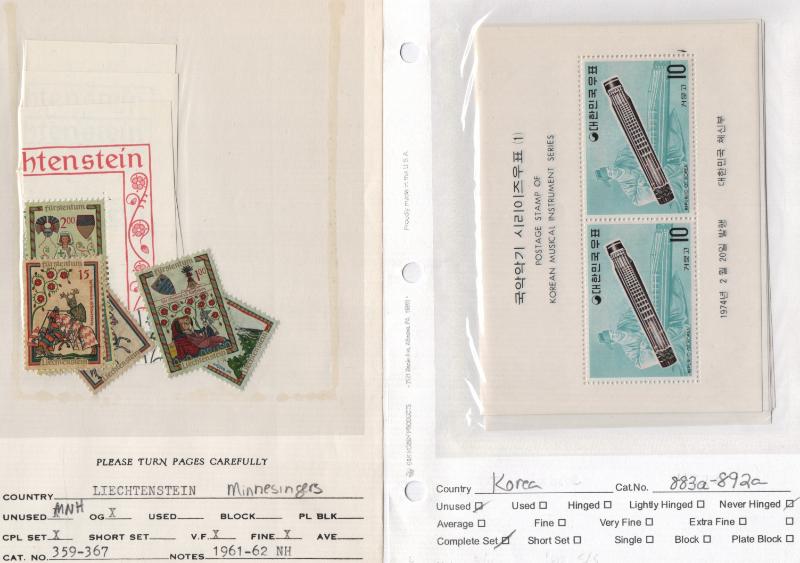 1420 image MUSIC Dealer Stock neatly organized in (8) 6x9 counter books, Aitutaki to Zambia, singles, full sets, se-tenants & S/S, ea labeled by Scott# & recent CV, from $1 to $125 but mostly $5-20 range; a few Dance topicals mixed in, occasional dup, noted Barbuda #768, BAT 293-96, Belgium B199, China PRC 702-07, 1117-21, 1126-29, France 2273-83, Germany 9NB4-5 NH, Iran 1130-32, Macao 524-29, Monaco 1181-86, Thailand 1009-16, UAE 402g-h; fewer of the "topical" countries & more regs & Brit Commonwealth; a few CTO sprinkled in but most are likely NH VF ex-Stamp Smith (Image) (imageb) (imagec) (imaged) (imagee) (imagef) (imageg) (imageh) (imagei) (imagej) (imagek) (imagel) (imagem) (imagen) (imageo) (imagep) (imageq) (All Images)
