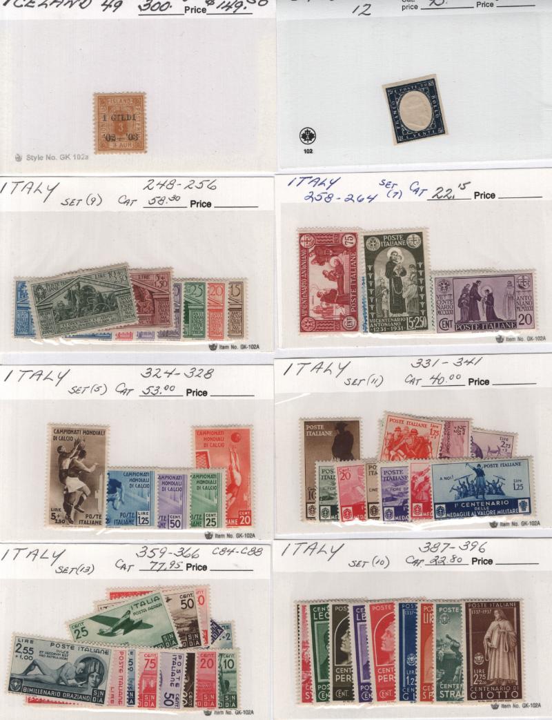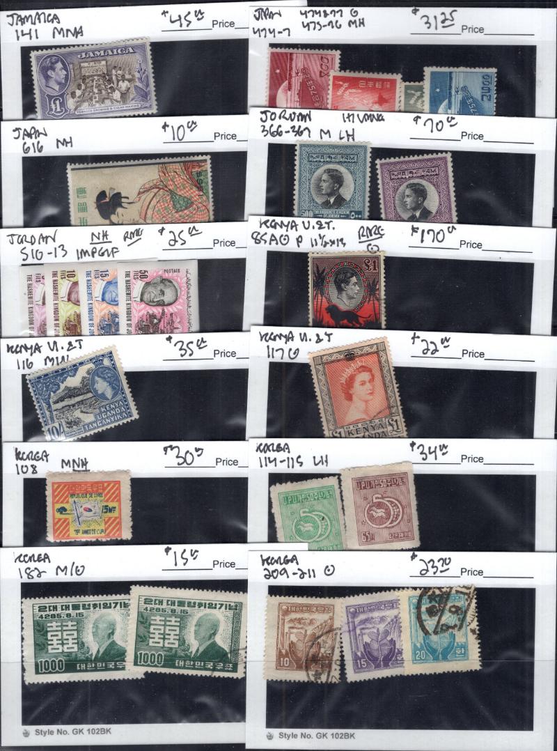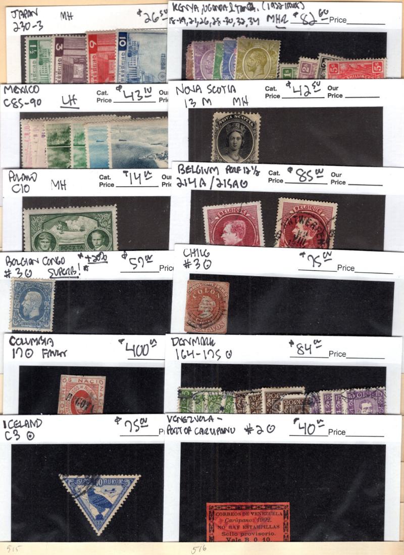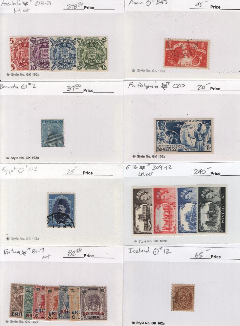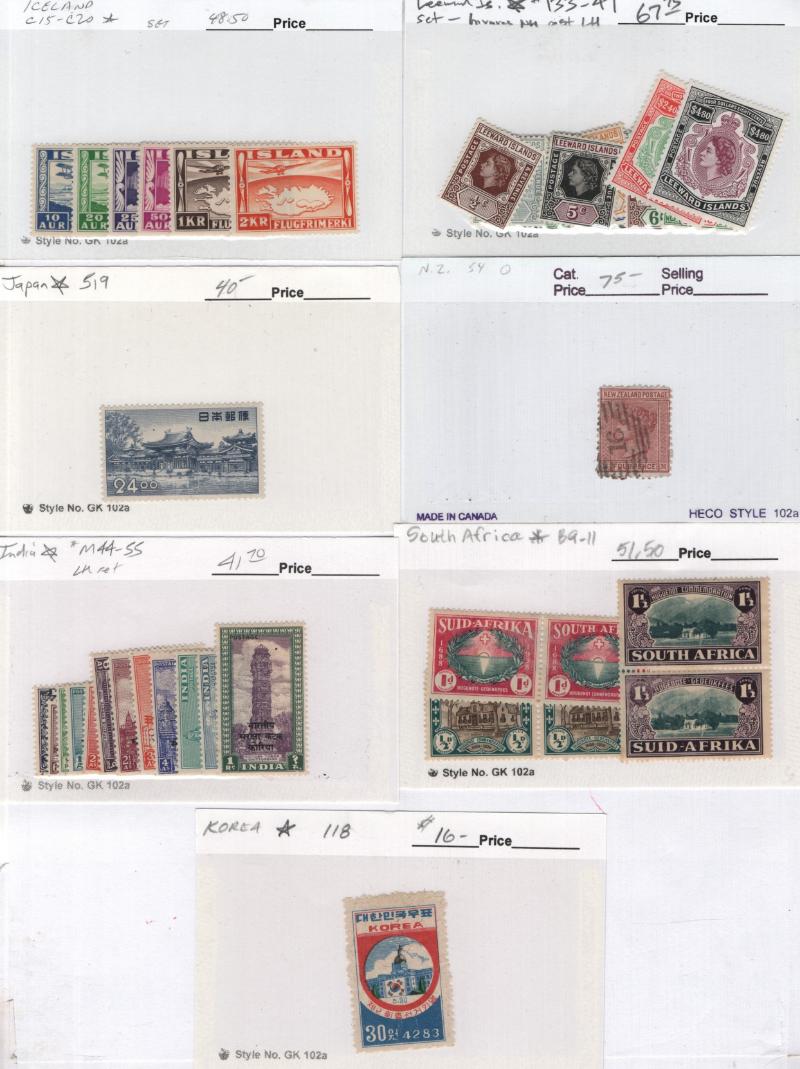 Stock many (100s) */O on abt (750) #102 cards, largely $5 & up incl Unused: Australia #218-21, Eritrea 81-87, GB 309-12, Iceland C15-20, India M44-55, Japan 519, Korea 118, Leeward Is 133-47, NZ 179-81, Papua C5-9, S Africa B9-11, Switz 200-03,