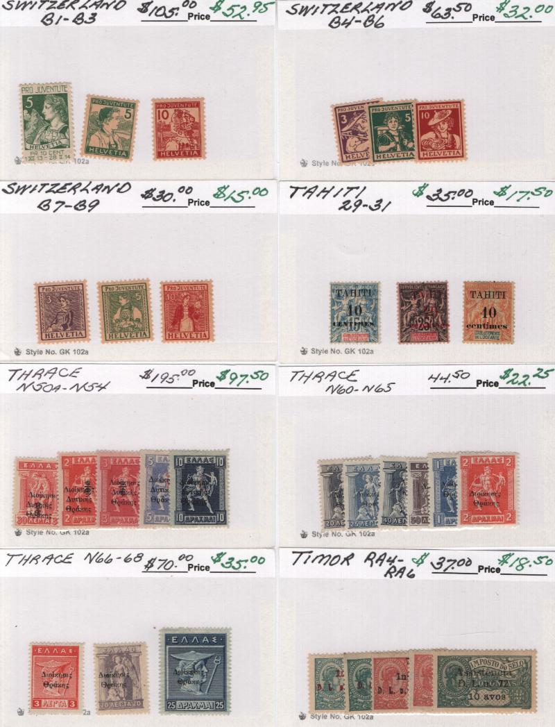 Accum abt (200+) */O 1850s-1930s "S to W" Countries on abt (100+) IDed 102 cards incl Unused: Switz B1-3, B4-6, B7-9, Tahiti 29-31, Thrace N50A-54, N60-65, N66-68, Timor RA4-6, Togo 254-57, Turkey M1-5, Virgin Is 76-85, Wurttemberg 72, O1-6, O7-11;