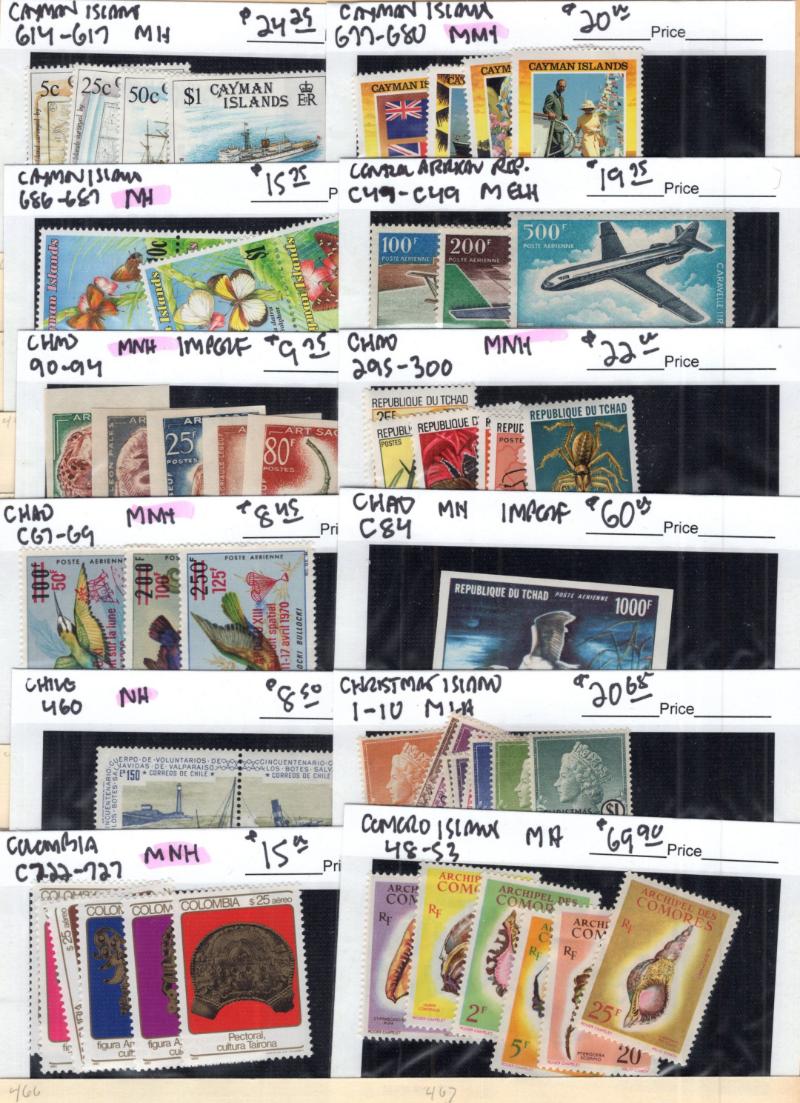 Central African Republic 67-72, C47-49, Chad 76-82, C84 imperf, Chile 460, Christmas Is 1-20, 254-69, 270-73, Colombia C722-27, Comoro Is 2, 6, 9, 10, 14, 45-62, 99-103, C1-C3, C5, C7-9, Congo Rep 212-13, 534-38, C240-43, Cook Is 164-69, 406-07,
