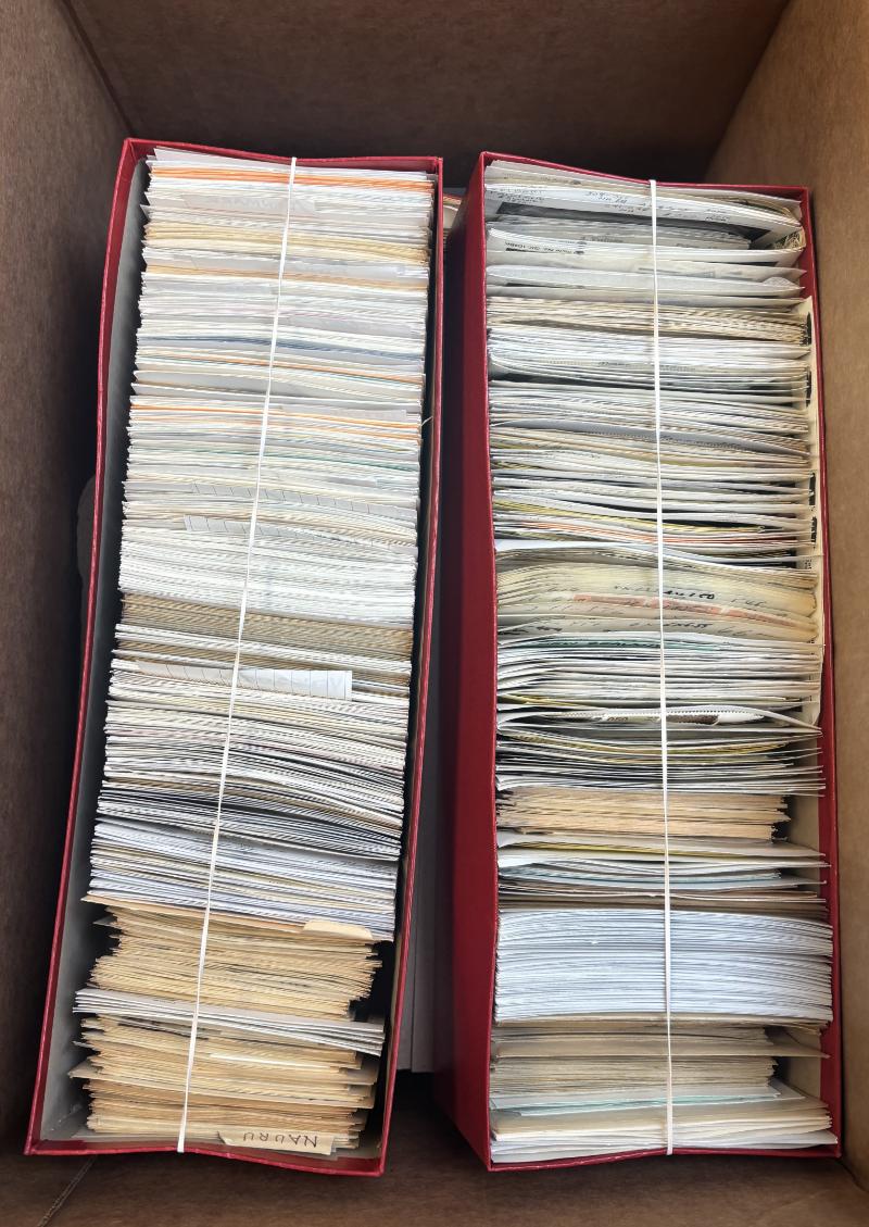 (18) red boxes A to Z loaded pretty tight */O w/ 70% being unused, many NH sets 1970-90s, most between $3-$10 CV w/ exception being some glassines are jammed full, some dup but also great variety, excellent lot for making topical sets! cond gen F-VF