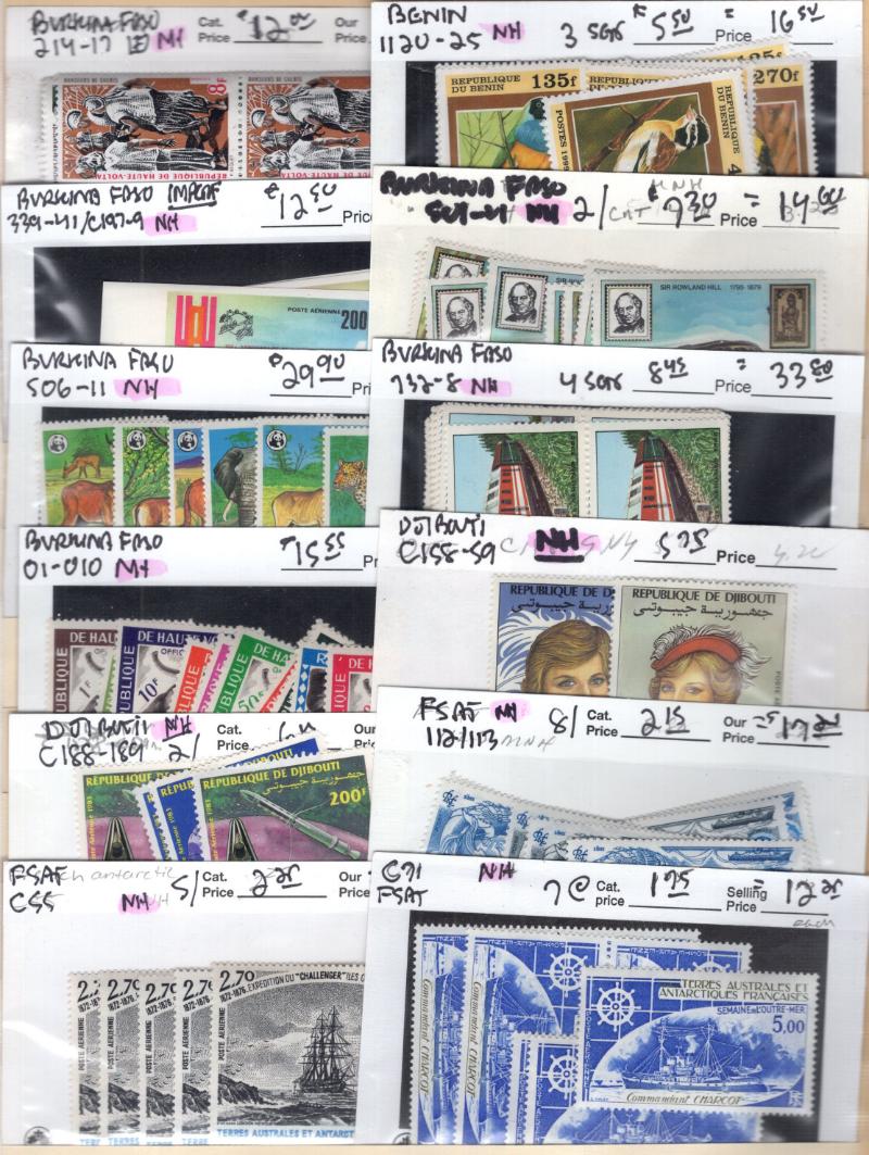 Dealer Stock (1000s) Unused mostly NH 20th Cent in abt (2000) IDed 102 cards in (3) red boxes, B-N Countries; incl Burkina Faso #214-17 Blks, 339-41//C197-99 imperf, 506-11, O1-O10, Djibouti C158-59, C188-89 (2), FSAT C55 (5), C71 (7), C77, Cameroun