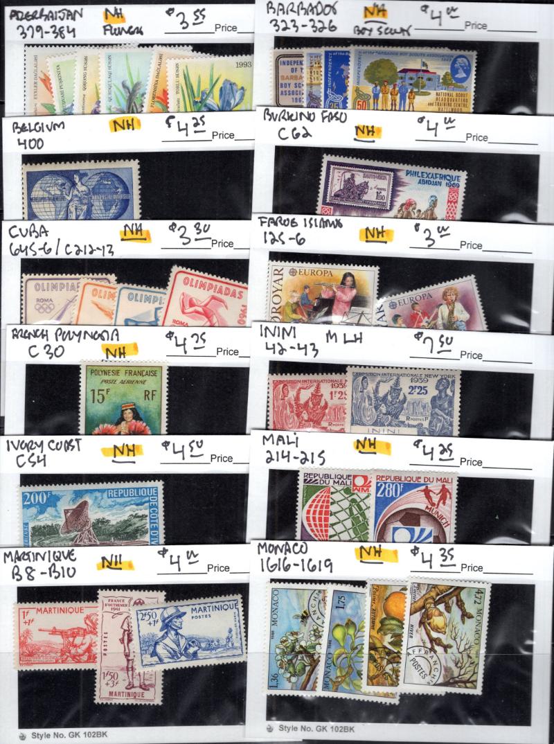 Dealer Stock (1000s) */O mostly 20th Cent in abt (1300+) HECO counterbook pgs incl Unused: Azerbaijan #379-84, Barbados 323-26, Belgium 400, Burkina Faso C62, Cuba 645-46, C212-13, Faroe Is 125-26, French Polynesia C30, Inini 42-43, Ivory Coast C54,