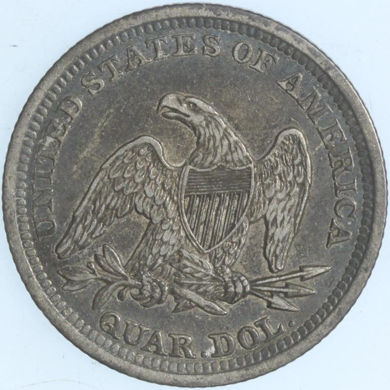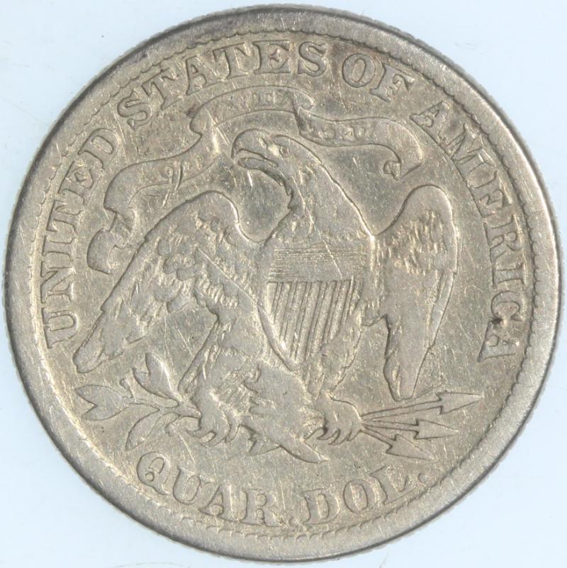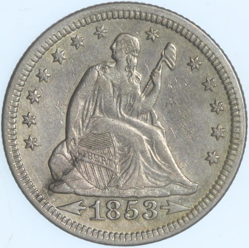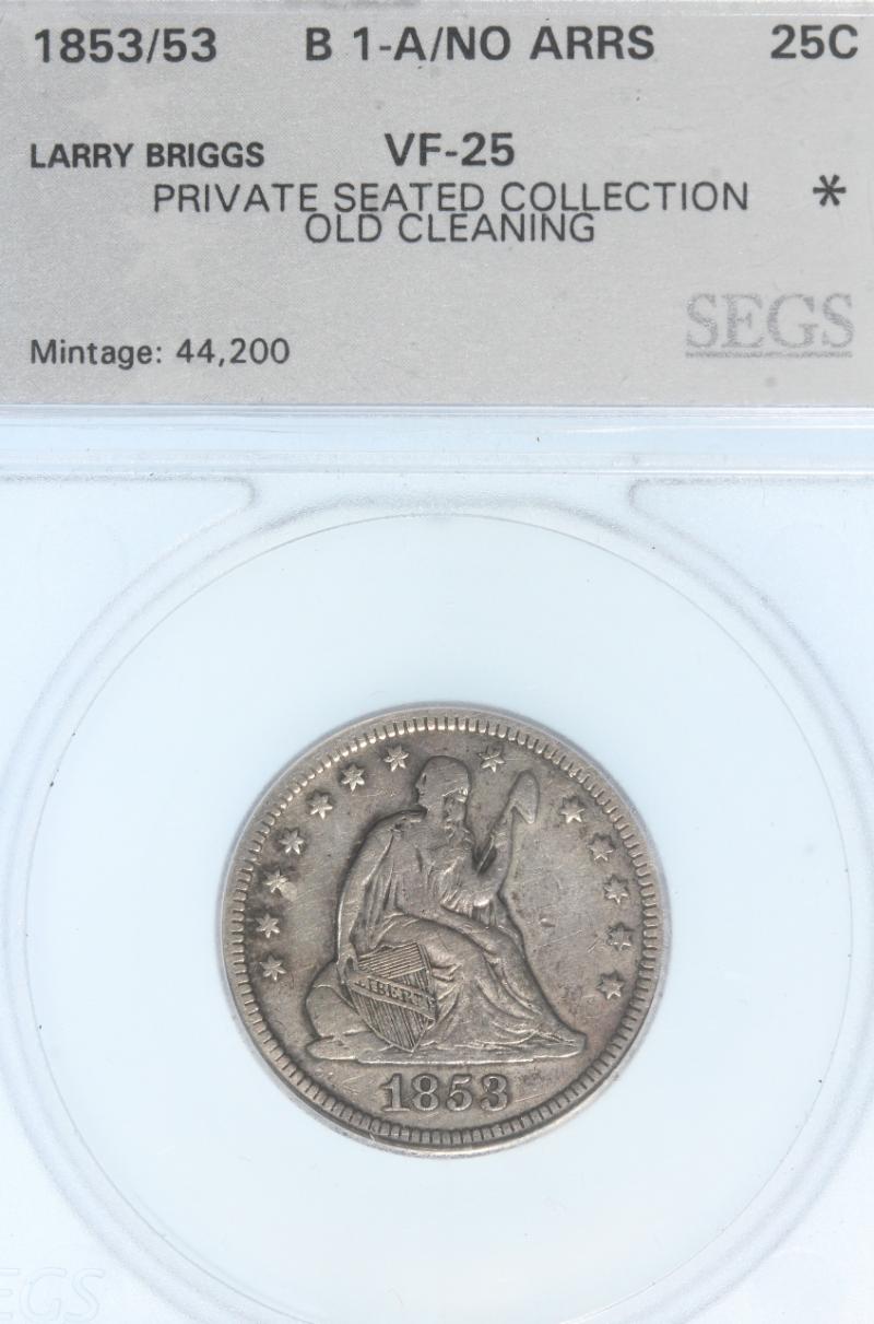 Arrows "53 over 53" B1-A SEGS VF25 Cleaned. From the Larry Briggs Private Liberty Seated Collection. 1853 No Arrows Quarters represent a very scarce variety and the price guides prove it. These coins were struck to the tune of 44,200 before the
