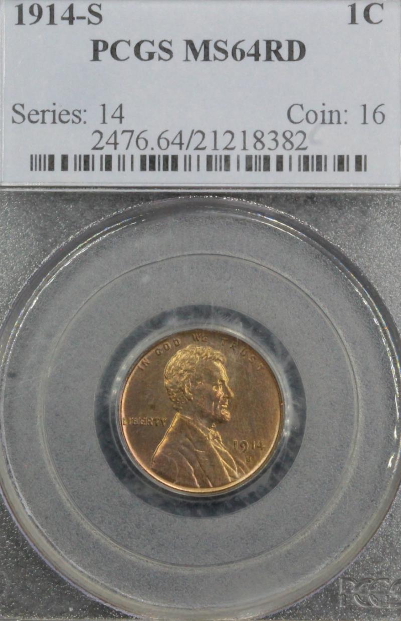 42 image 1914-S PCGS MS64 Red. Regarding this issue and its scarcity in MS Red, David Lange, author of "The Complete Guide to Lincoln Cents" has opined that, " . . . mint state coins that have not been cleaned (and these are few in number) will be fairly dark, precluding the designation MS Red in all but a few instances. [Though there is] occasional leniency when it comes to grading the rarest dates, the commercial grading services have still certified very few 1914-S cents as MS Red. The present coin has an excellent strike for a 1914-S, a point to which Lange explains, " . . . . . . sharply struck coins are invariably dark, while the few bright examples tend to be mushy." This offering is surely a great opportunity for the Lincoln Cent specialist. (Image) (imageb) (All Images)