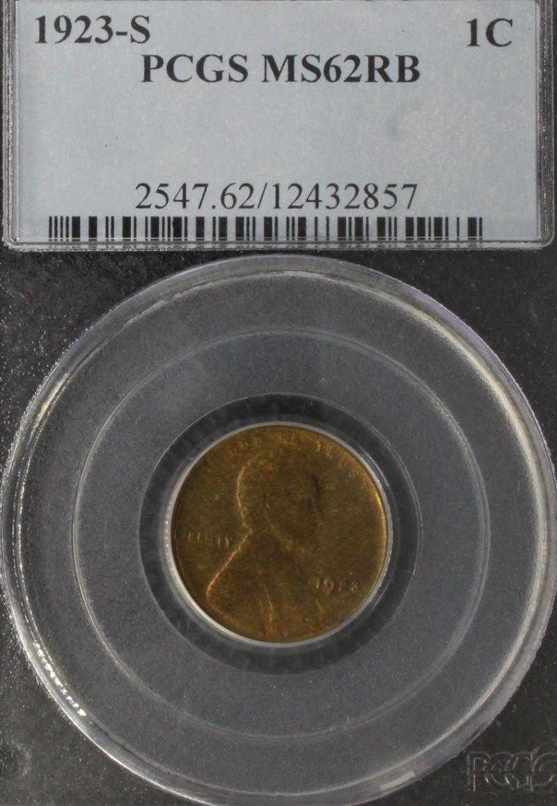 52 image 1923-S PCGS MS62 Red-Brown. An interesting coin in that it has a poorly-struck obv, but an exquisitely detailed rev. This attests to the fact that regarding cent production of the era, dies were retired one by one as opposed being replaced in pairs. (Image) (imageb) (All Images)