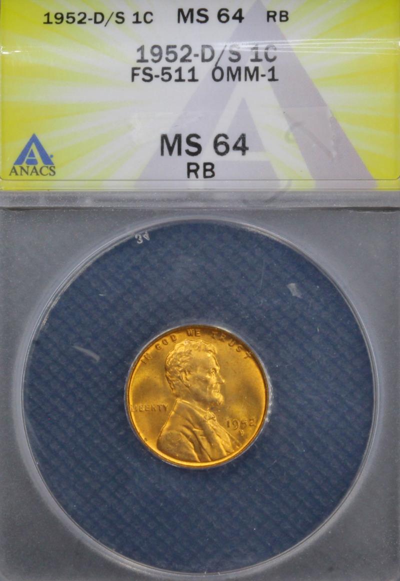 63 image (2) Different ANACS Certified varieties including 1952-D/S FS-511 OMM-1 MS64 RB and 1956 D/D WRPM-18 Muir Collection MS62 RB. (Image) (imageb) (imagec) (imaged) (All Images)