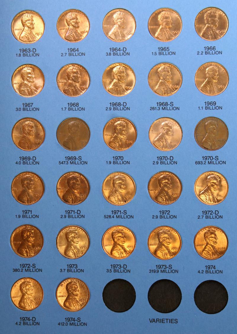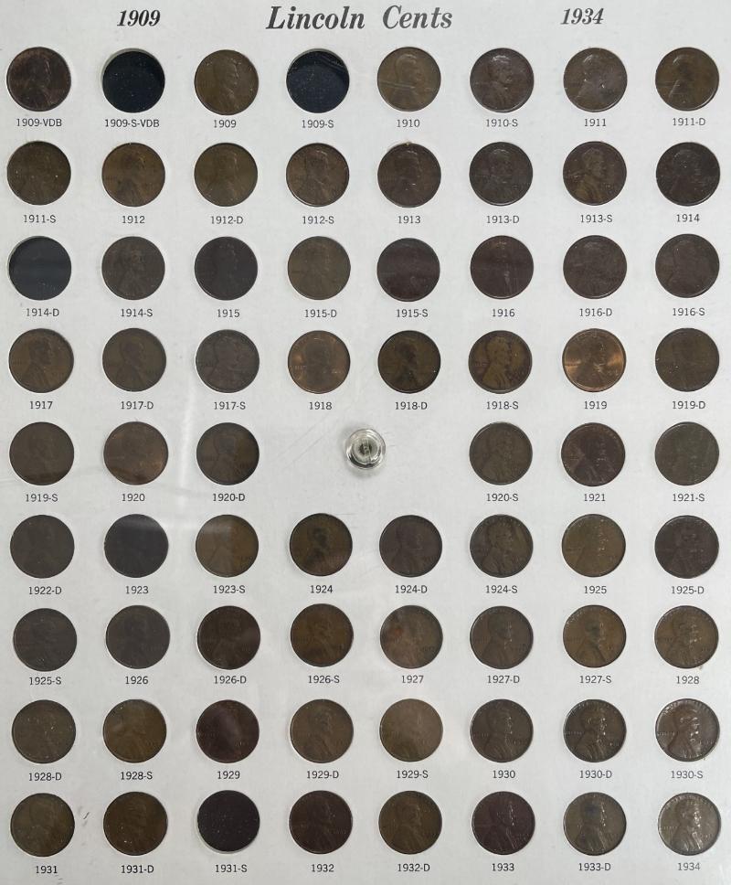 64 image (66) Diff in a near-complete set 1909 // 1934 in a Capital plastics frame. Missing only 1909-S VDB, 1909-S, 1914-D, & 1931-S, grades vary widely from G or lower w/ corrosion to nice unc especially 1918, 1919, & 1920 which have loads of original red. Sev laters are XF or better. Inspect! (Image)