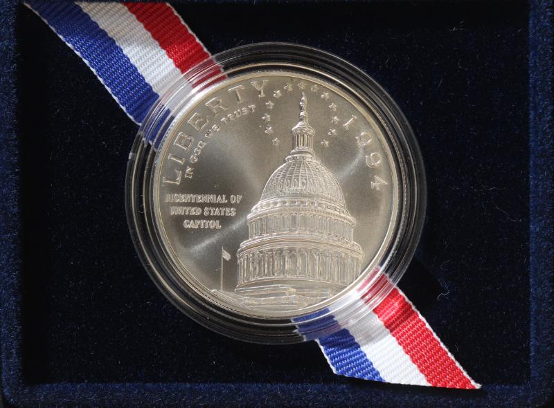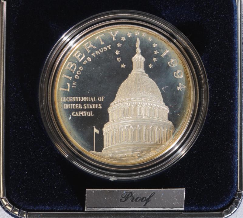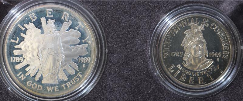 Commemorative coin sets incl 1989 US Congress Proof 2-coin set (silver dollar and clad half-dollar) and MS and Proof 1994 US Capitol Bicentennial. All in OGP w/ papers. MS OGP has been roughly handled in the past. ASW=2.28oz. (Image) (imageb)