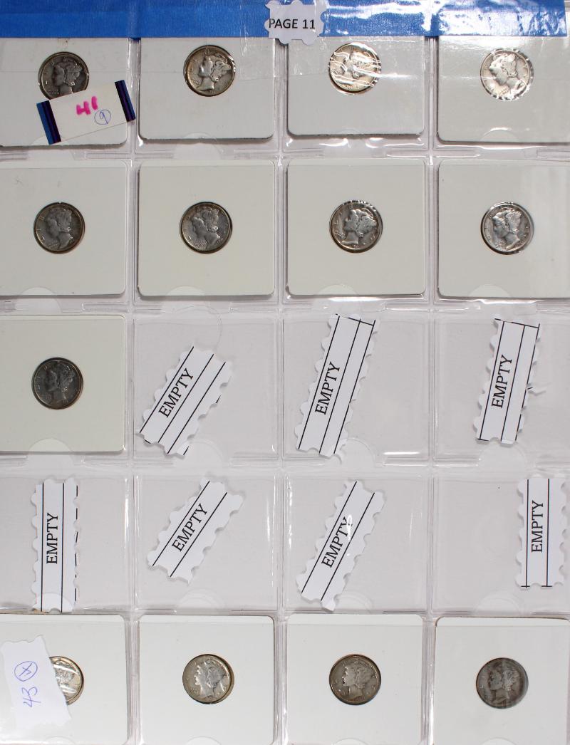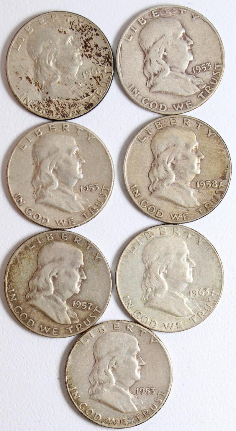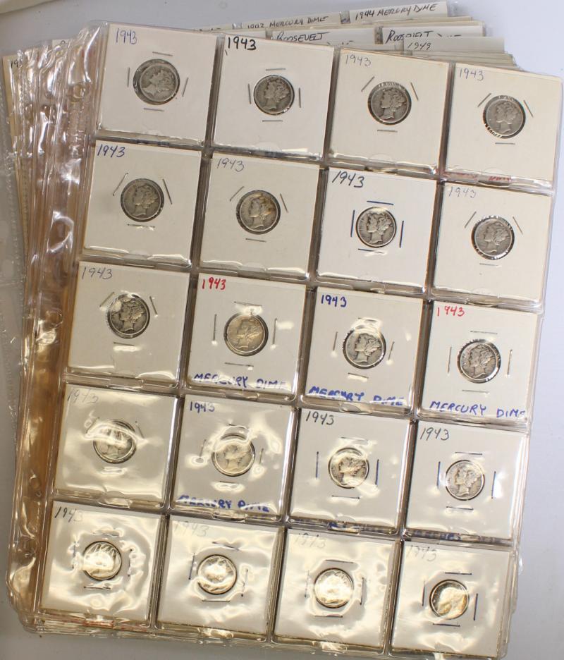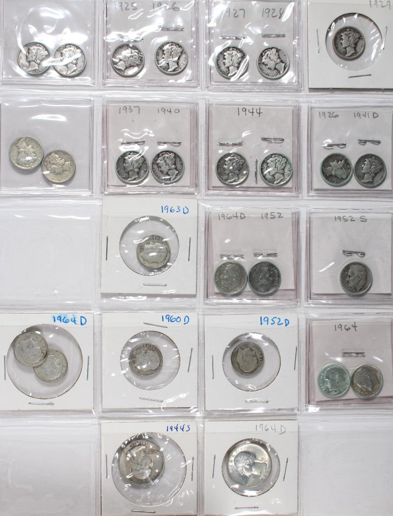 face. Mixed lot incl Mercury and RSVLT dimes, Wash quarters, Walking, Franklin & Kennedy Halves. All IDed, housed in flips and 2x2s. Coins housed in old flips have some green toning on edges. (Image) (imageb)