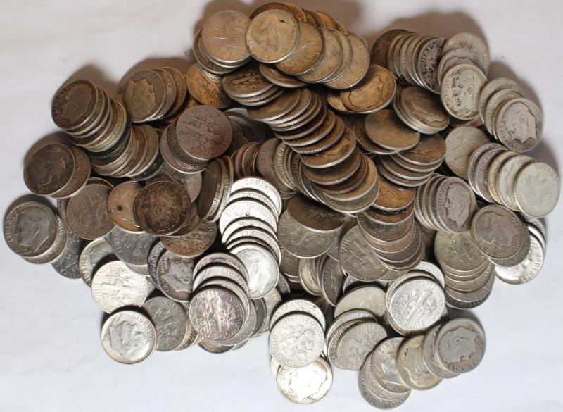 face. Mixed lot of mostly Mercury and Roosevelt dimes but also incl several Standing Liberty quarters and Kennedy halves. (Image) (imageb)