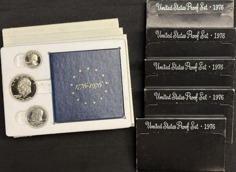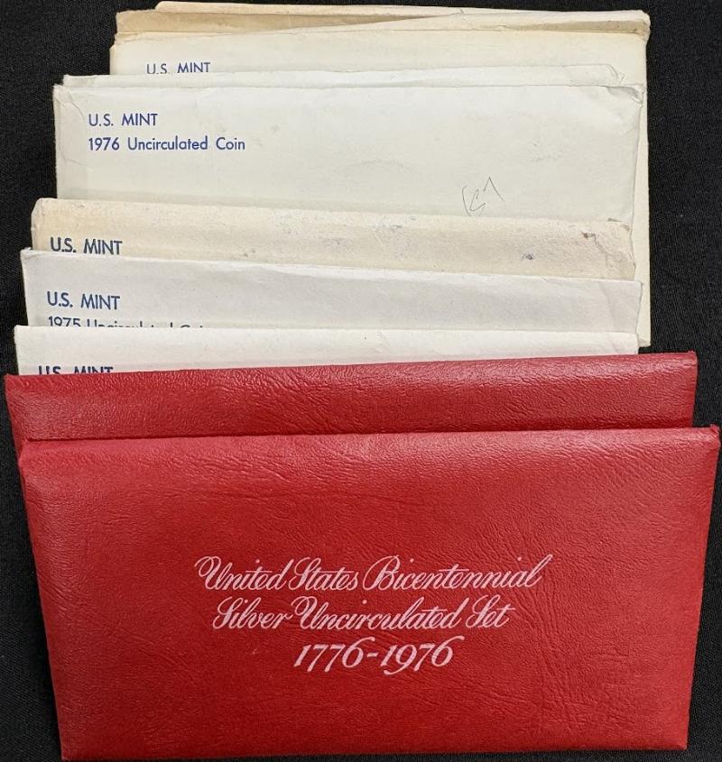 Bicentennial Proof sets incl (3) 1975 Mint sets (5) 1976 Mint sets and (2) 1976 3-Piece Silver (40%) Mint sets. All in OGP. (Image)