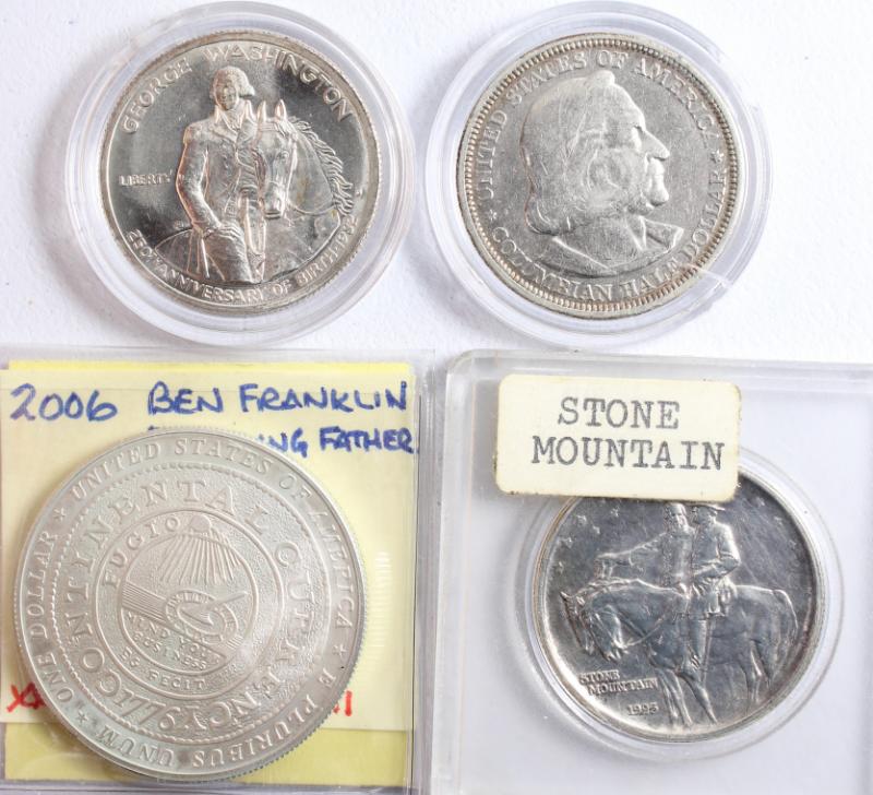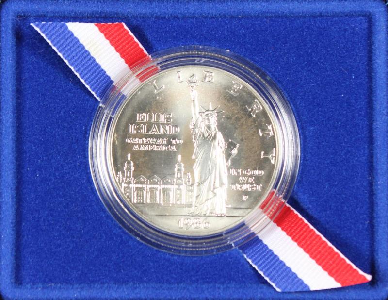 Commemorative coins incl 1986-S 2-Piece Statue of Liberty coin set (Proof Silver Dollar and Proof Clad Half-Dollar), 1992-S Columbus Proof Silver Half-Dollar, 1995-S Civil War Proof Silver Dollar, & 2006-S San Fran Old Mint Uncirculated Silver