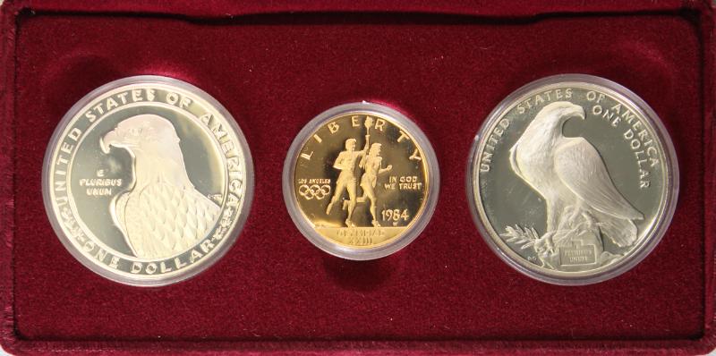 1983-1984 US Olympics Gold & Silver Proof Commemorative 3-Coin Set incl $10 gold coin, (2) $1 silver coins. In OGP with COAs. AGW 0.4838 ozt. ASW 1.546 ozt. (Image)