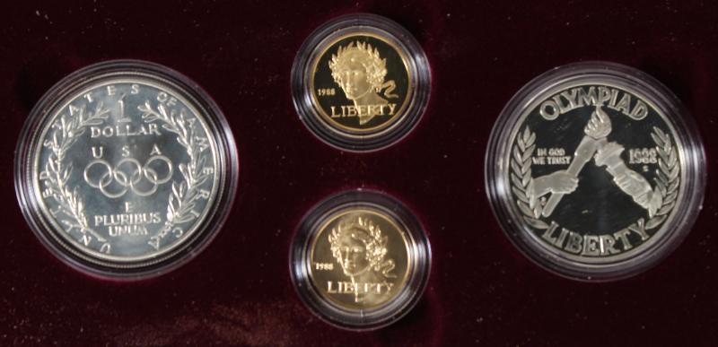 Olympic 1988 4-coin Proof & Unc set in original Mint wooden box, incl (2) $5 Gold & (2) $1 Silver. AGW= 0.5374 ozt. ASW=1.7188 ozt. (Image) (imageb)