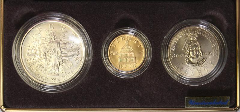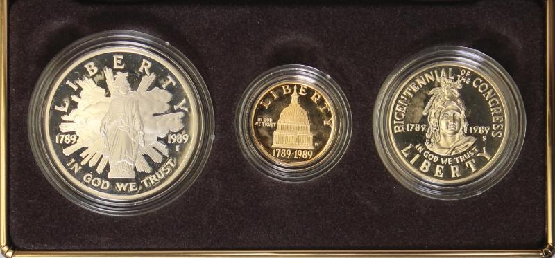 Congressional Gold and Silver 3-Coin Proof Set incl $5.00 Gold coin, $1 Silver coin & Half-dollar clad coin. This set was issued to mark the 200th anniversary of the operation of Congress under the U.S. Constitution. OGP with COA. AGW .2419 ozt. ASW