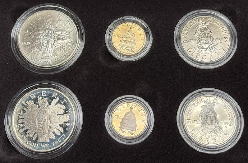 Congressional Gold and Silver 6-Coin Proof & Uncirculated Set incl (2) $5.00 Gold coins, (2) $1 Silver coins & (2) Half-dollar clad coins. This set was issued to mark the 200th anniversary of the operation of Congress under the U.S. Constitution. OGP