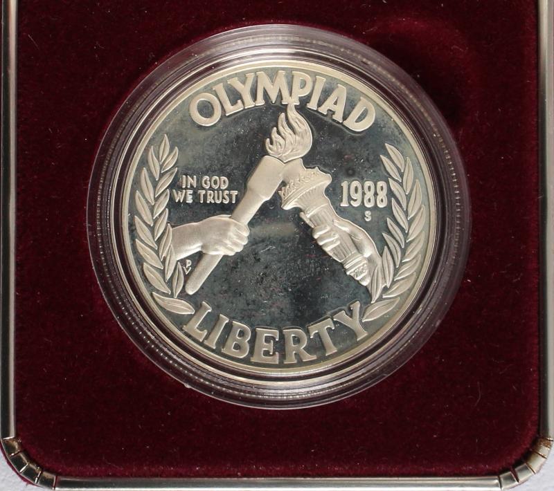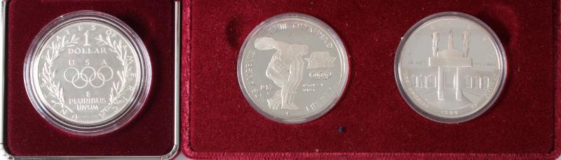 Silver Proof Commemorative sets incl 1983-1984 Olympic 2-piece dollar set & 1988-S Olympic dollar. Both housed in OGP. The 1983-1984 set packaging is worn and missing the COA.