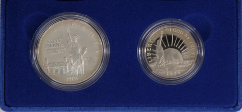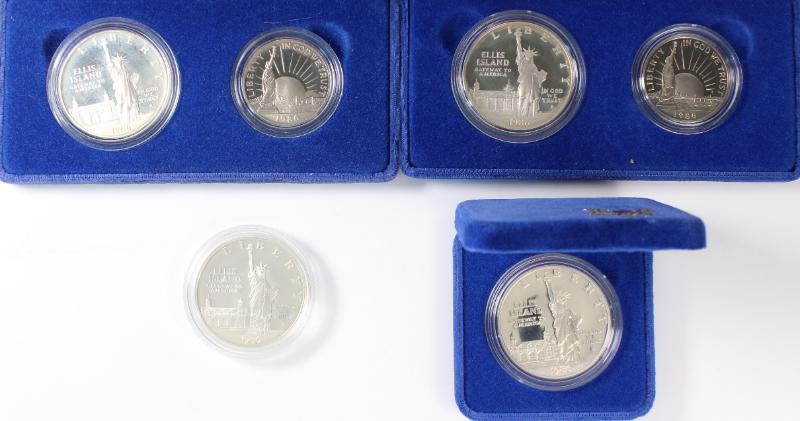 1986 Statue of Liberty Silver Proofs incl (2) SOL 2-Piece sets and (2) individual dollar Proofs (one in a blue felt-lined presentation case, the other in a plastic capsule).