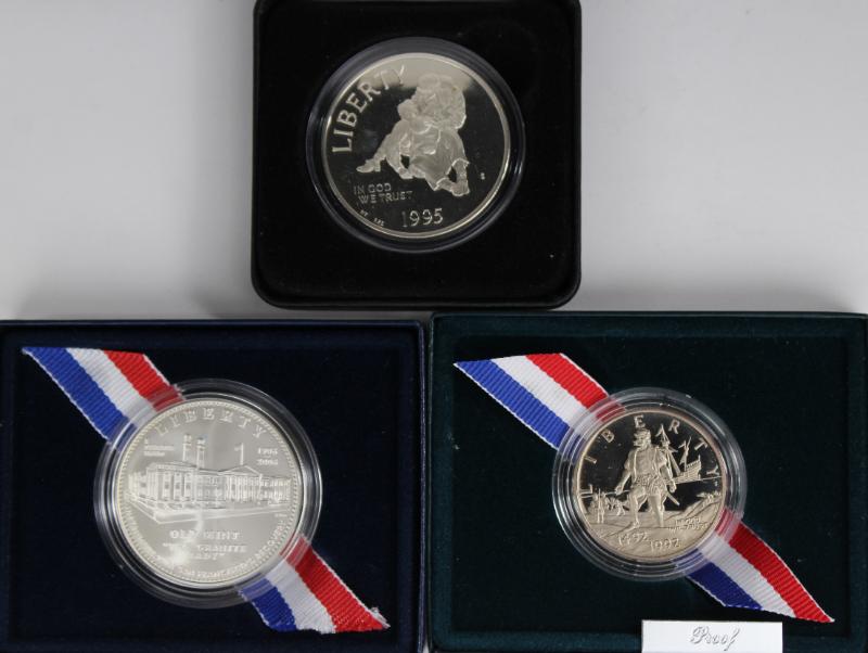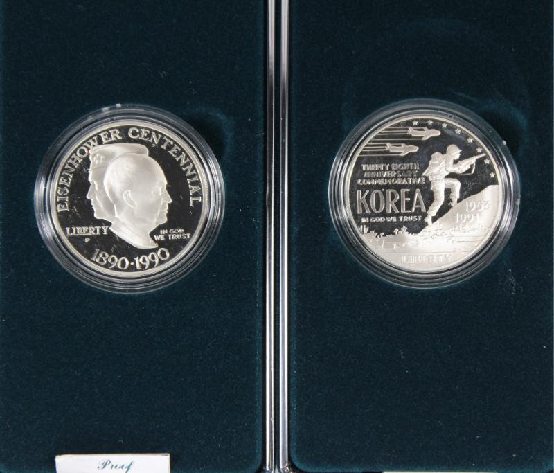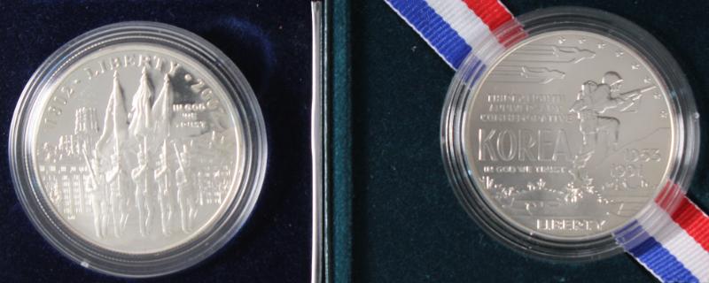 Commemerative Silver Dollars incl. 1991 Korean War D-Unc (3) and 2002 US Military Academy Bicentennial W-Proof. All in OGP with COA. (Image)