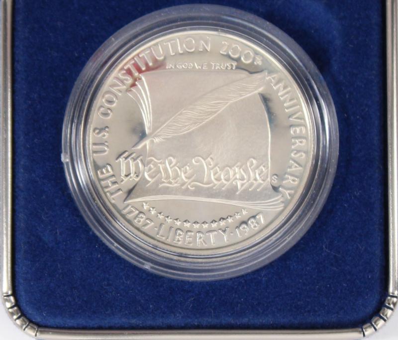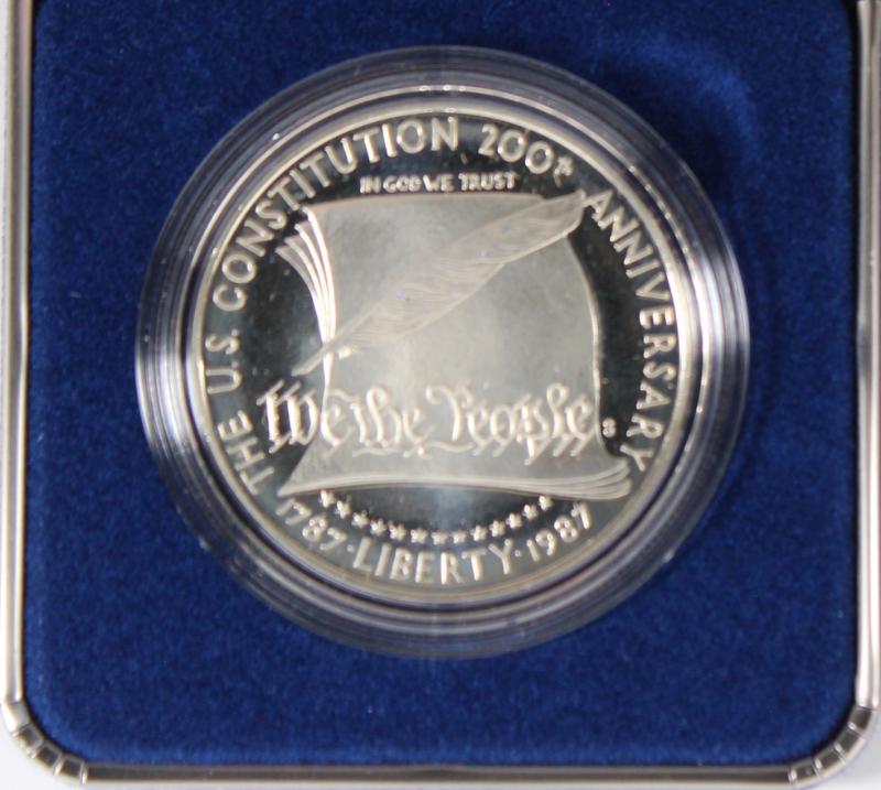 1987 US Constitution Commemorative Silver dollars incl. (4) S-Proof (2 housed in OGP with COA, 2 housed in presentation cases) and (1) P-uncirculated. (Image) (imageb)