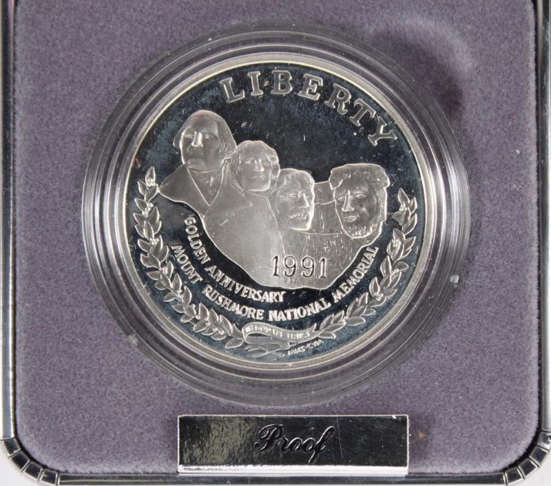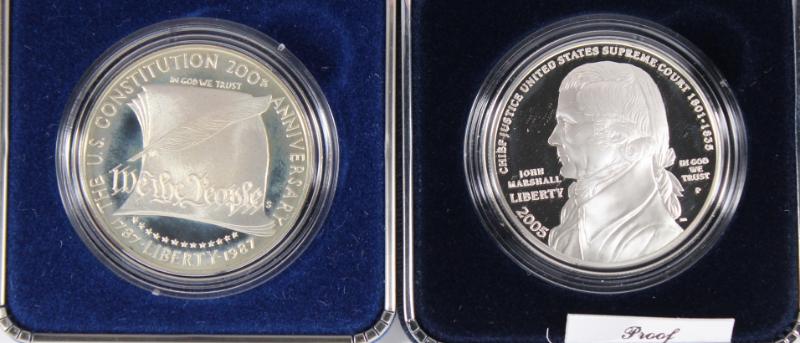 Diff Silver Proof Commemorative dollars incl 1987-S US Constitution, 1990-P Eisenhower, 1991-S Mt. Rushmore, 1991-P Korean War, & 2005-P John Marshall. All in OGP. US Constitution outer slip cover heavily worn and missing COA. (Image) (imageb)