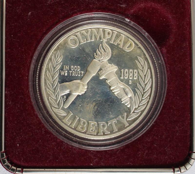 1988-S Olympic Silver Coins. Housed in OGP. One set has damaged packaging and is missing COA. ASW=1.5469 ozt. (Image) (imageb)